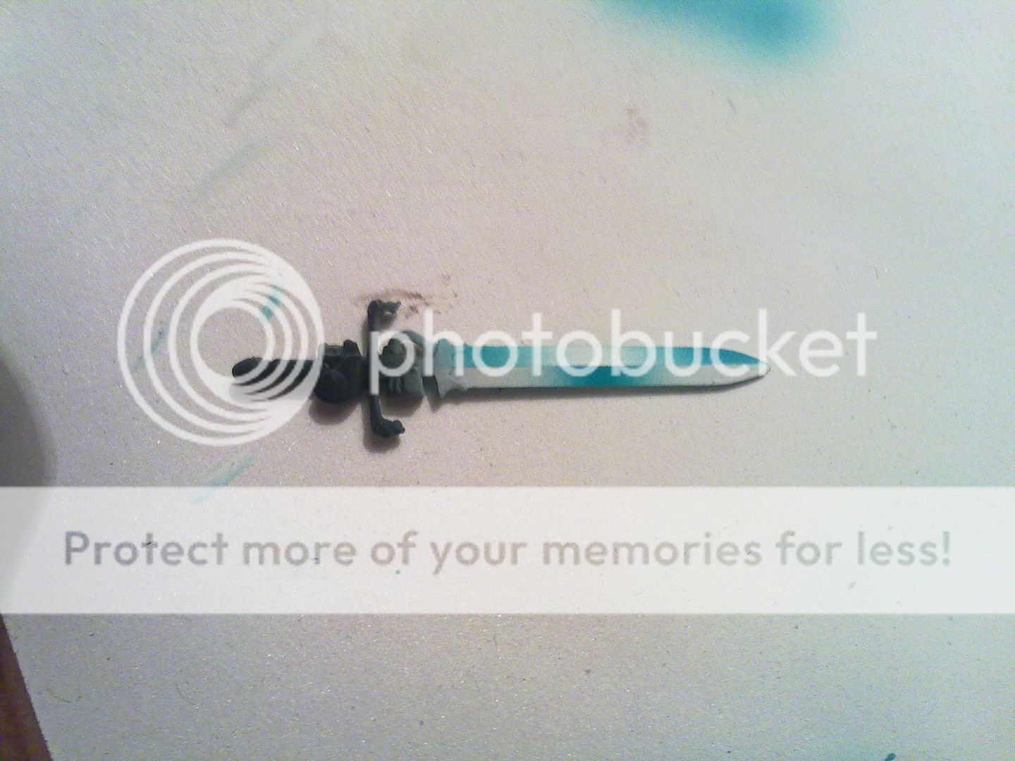 3. Now use the airbrush to lay the first layer of paint, which is the white. make sure that the blade of the sword is coated evenly with white. This may take a few layers.