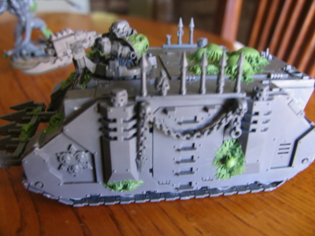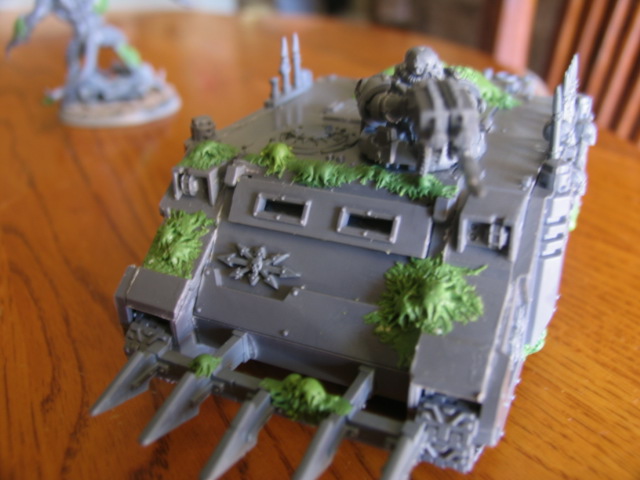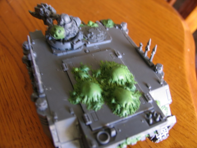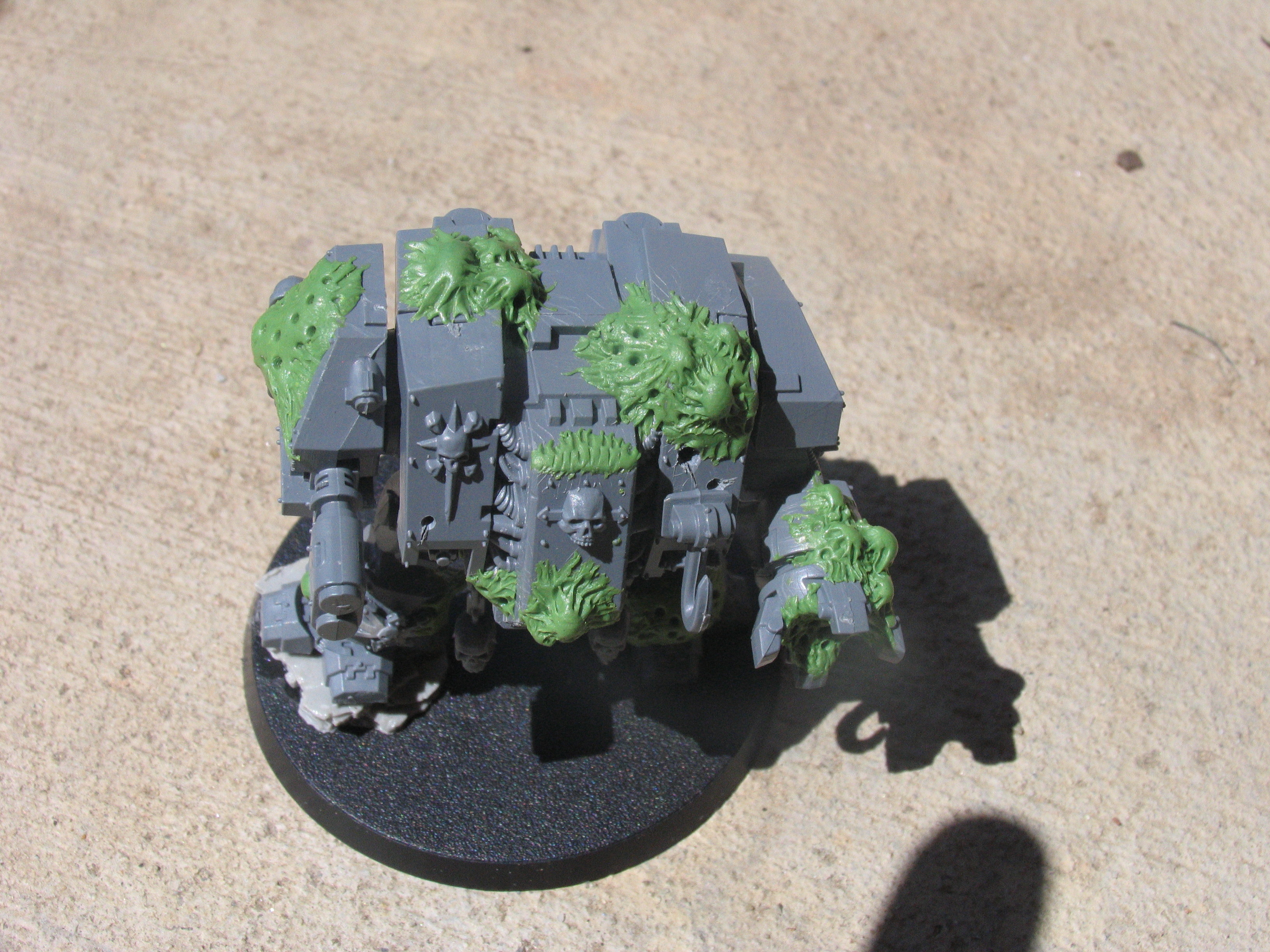hey guys, here are some pics of a rhino and a daemon prince that i am making more nurglicious. the rhino is pretty much done, the prince, i'm thinking of maybe doing a little more, but i do like the look of the original model itself and don't want to take too much away from it. anyways, thought i would share with you, it's my first time working with greenstuff. there will be more pictures in the future too, as i've got more rhinos and more standard infantry to work on!
