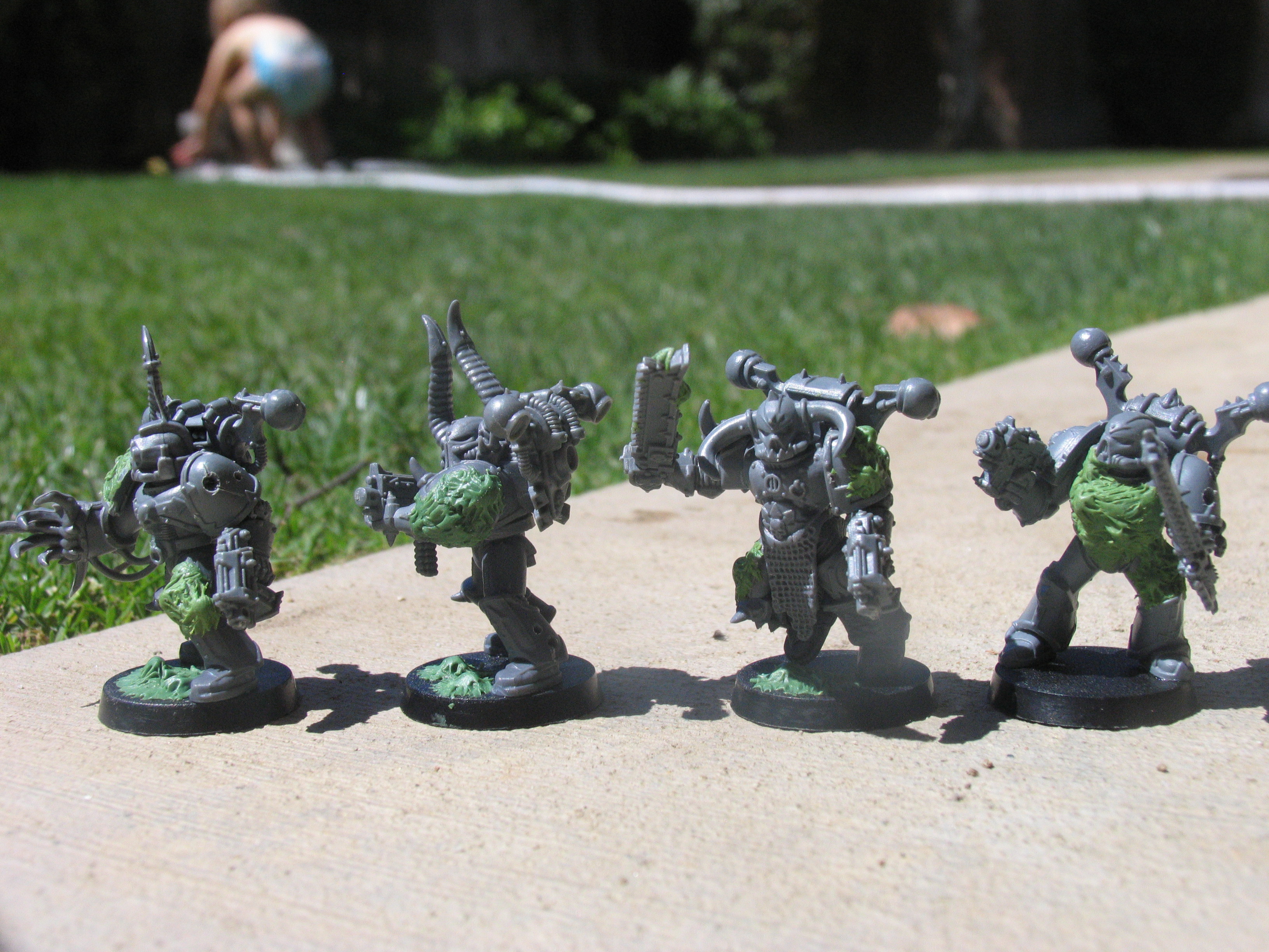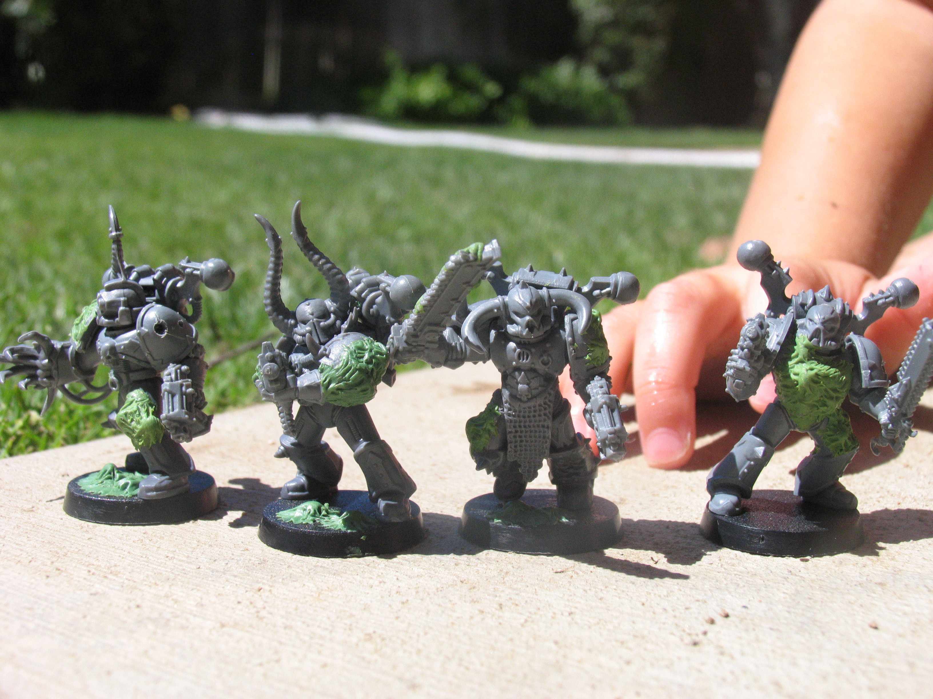 right now i have a small squad of death guard from the box. not too much that i did with them aside from add some pustules onto their backpacks and some more onto the bases and one of the melta's that was from the regular CSM infantry box.