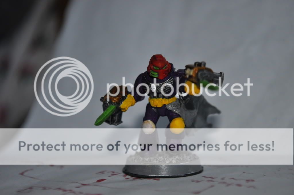 @Gretar : yeah i get the color scheme comments alot, i have prussian heritage and my chapters symbol is my family crest. And instead of giving every solder a deep red or deep blue color scheme * BA / Ultramarine* look, i went with more of a crisp royal purple look. I needed a secondary color to break up the purple so i picked yellow for its position on the color wheel. My family crest/chapter emblem colors are Silver and Red.