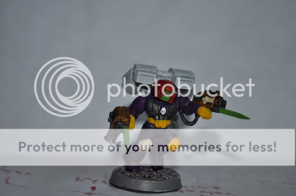 I think im going to continue painting seeing as im in kind'a a painting mood. And after giving it some thought i think im going to do his eyes and blades in greens, i think that will pop better vs the red helm and deep purple armor. Still at a lose to spiff out the jump pack, Wife stated to "Paint Flames or put Wings on it." The flames idea seems a bit cliche, but i like the idea about wings... any one know of what models *fairly inexpensive* that have small wings that would look cool attaching to the side of a jump pack?