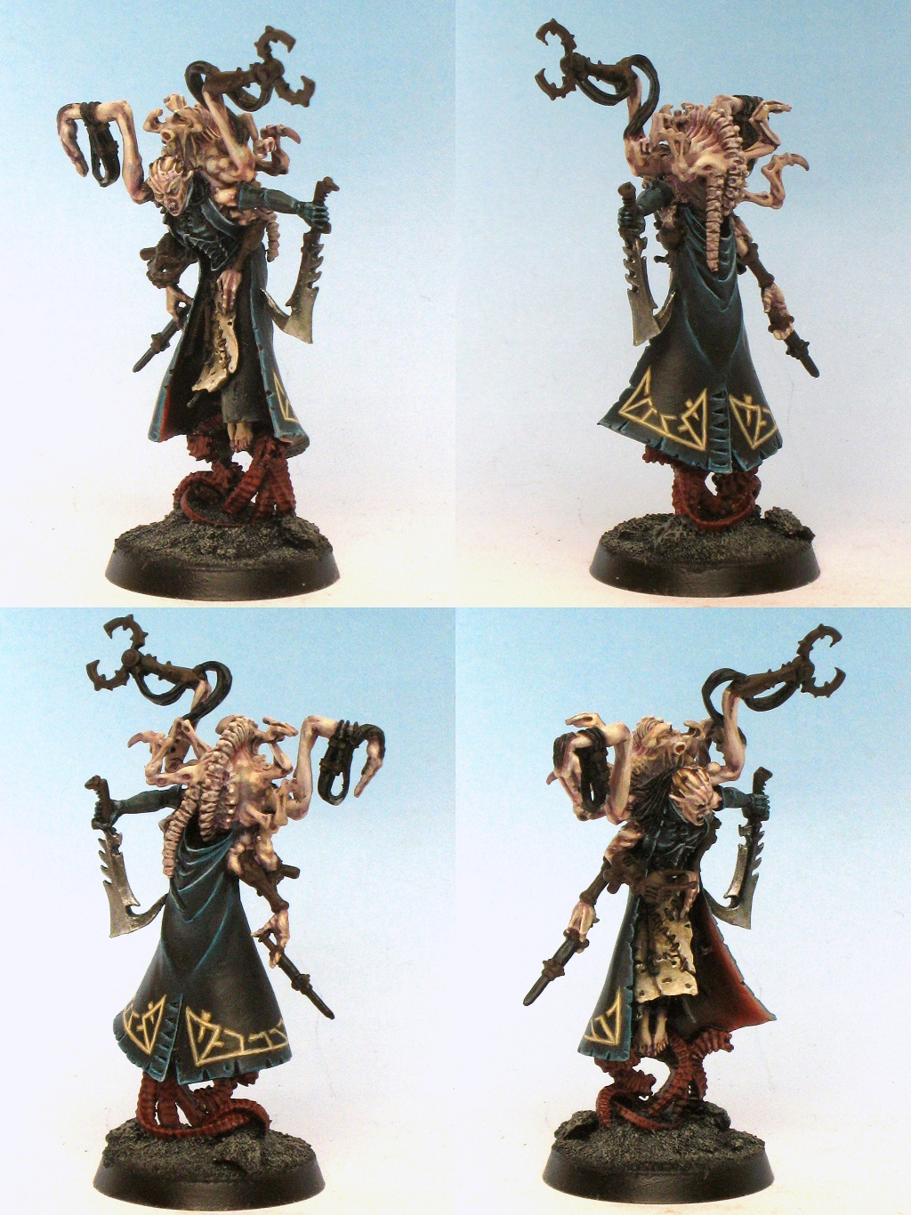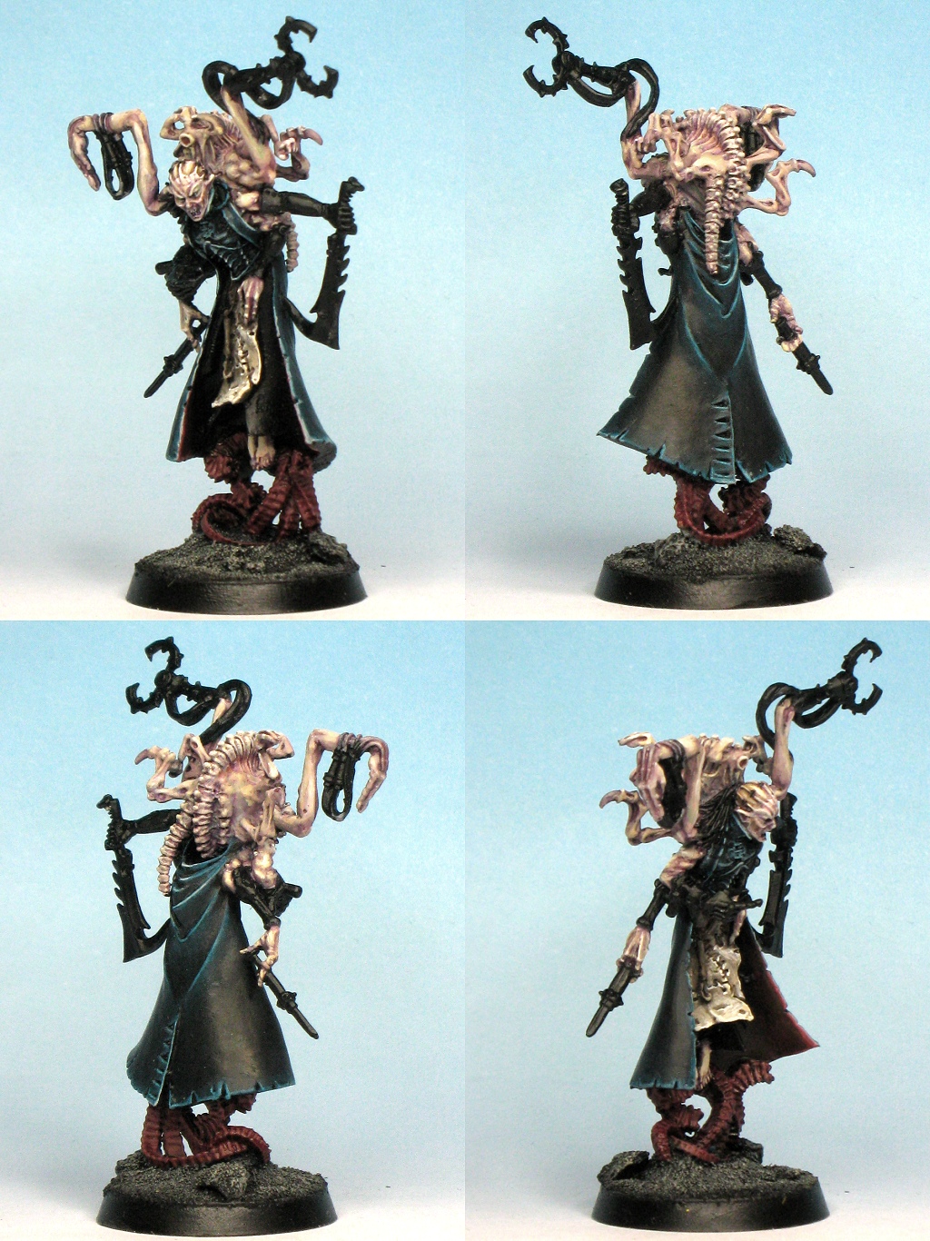 Another commission, the freaky Dark Eldar mutant dude, Urien Rakarth. Lots of fun with skin colour here, greens, purples, red tints... still some details and further highlighting to do - will probably repaint the lining of the coat to go a lot more vibrant.