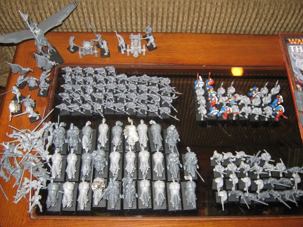 77 Empire Spearmen w/o shields (mix of new set and about 20 of the older 3-piece ones (some of which have shields and are painted))