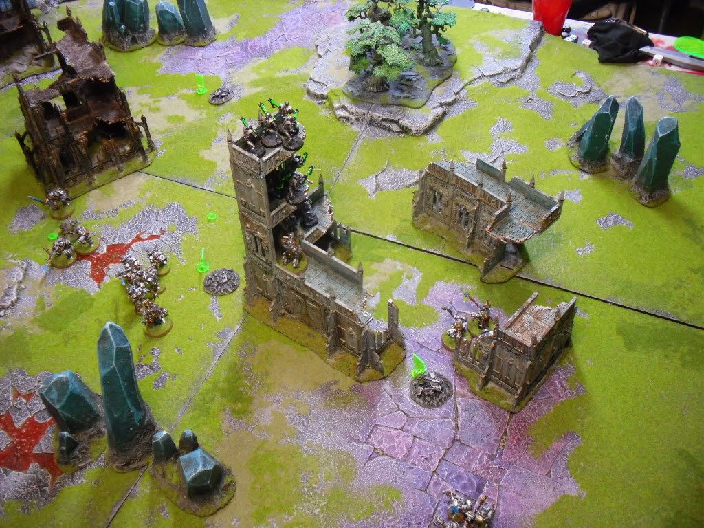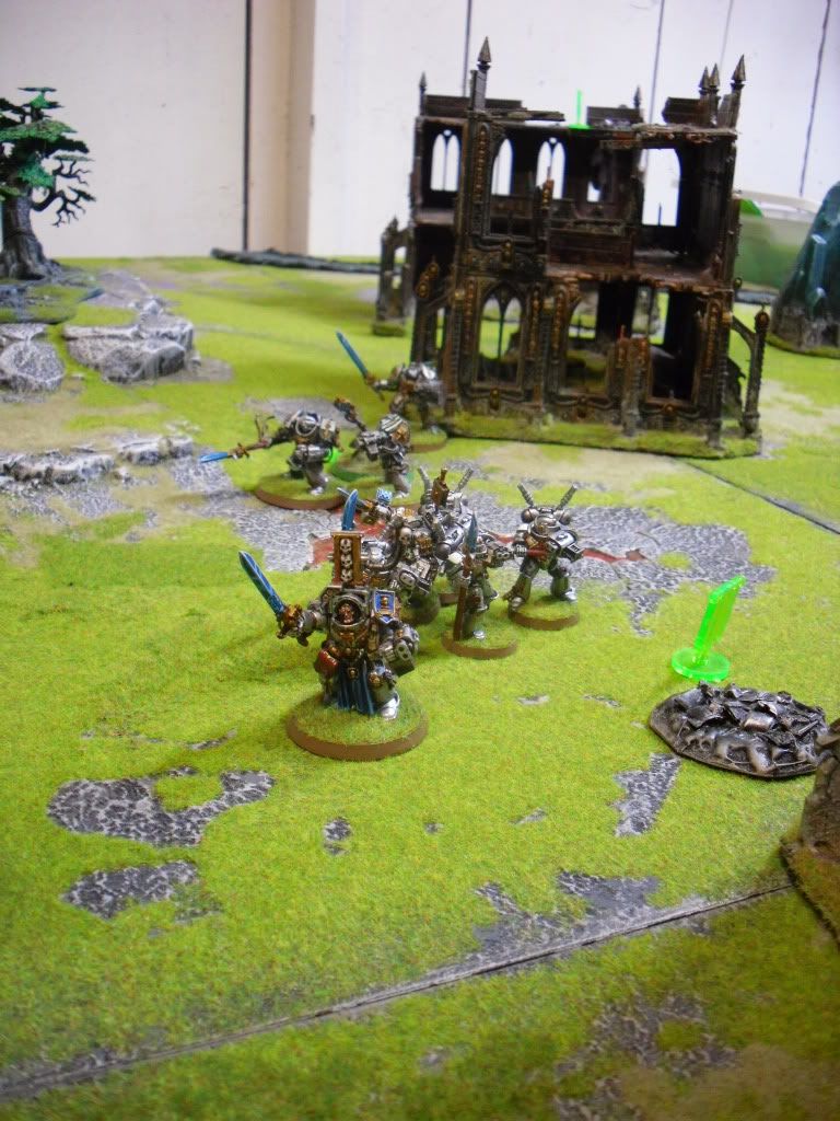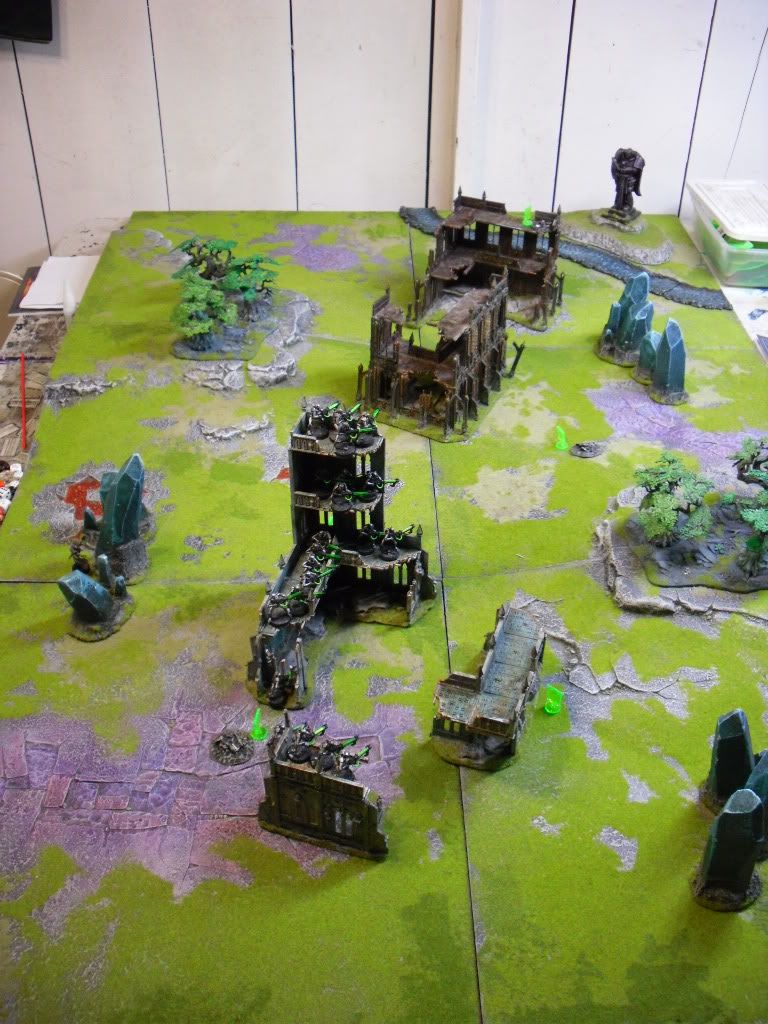 I (Solomon) win the roll and hand it to Dave to go first. Dave droped three of the five Objectives around the near cluster of buildings and during deployment, set up the bulk of his forces on them. I, being a cheeky Grey Knights player, decide to Deep Strike everything