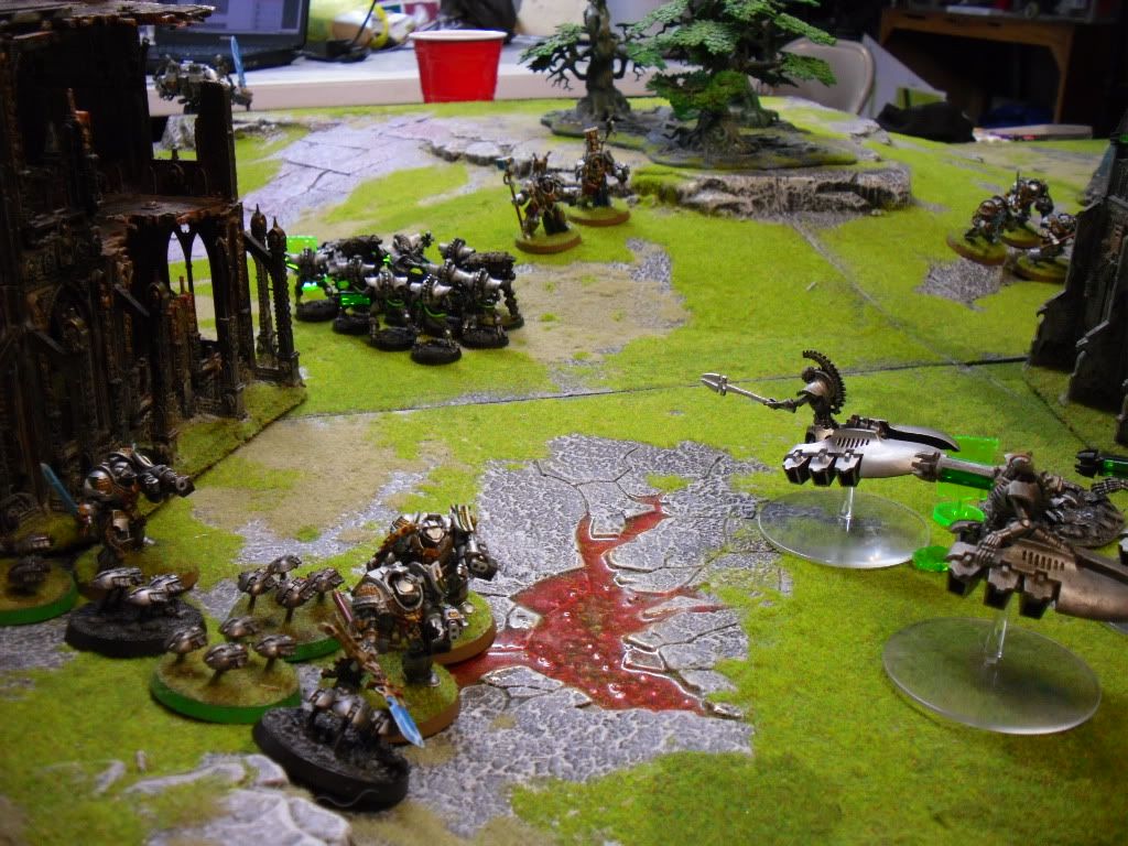 The turn begins with the Dread Knight showing up in the wrong dimension. I Scattered him 11 inches right off the table  At this point, it looked like my army was fated to lose this skirmish, and badly. It is at this point that I remember the power I gave my Librarian. I move in to cast Warp Rift on the Lord and his Immortals. A good number of Immortals roll 1s and 2s, but critically the Lord gets sucked into the warp, grounding them there. The interceptors aid the Librarian in finishing off the Immortals in combat as the rest of my terminator squads get bogged down and greatly out numbered by Scarabs and Warriors.