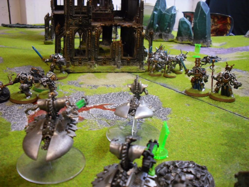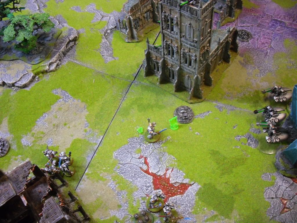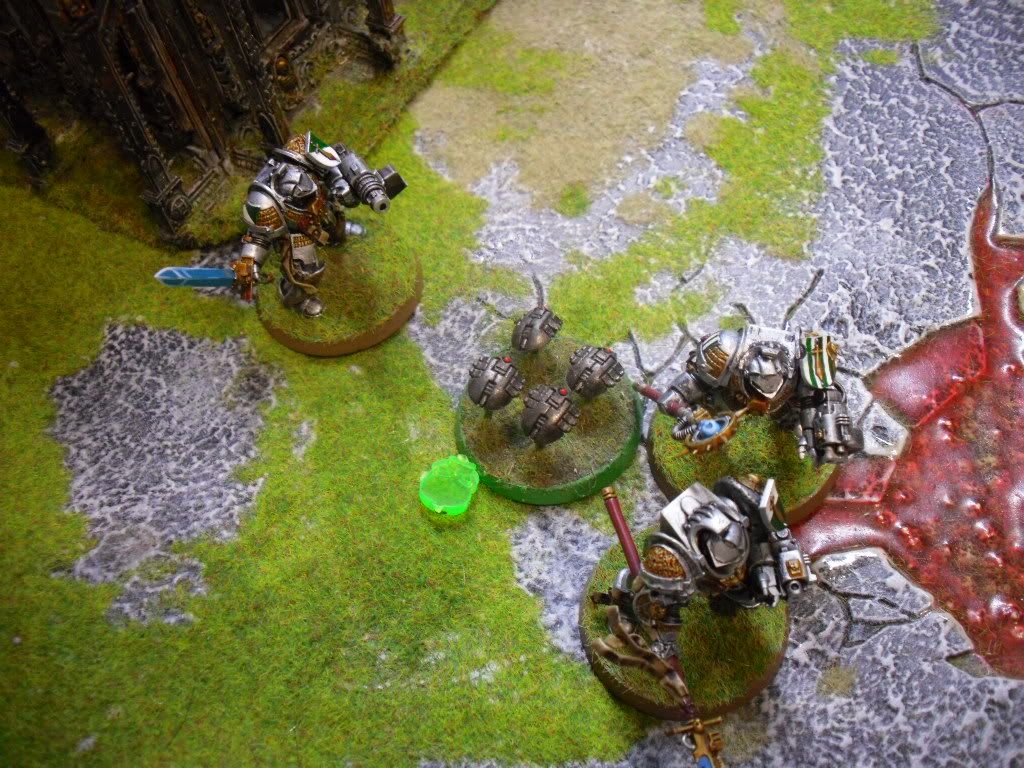 The Grey Knights teleport in, all units Combat Squadded. Only one half of the Interceptor squad and the Dread Knight fail to show up yet. Necron casualties are relatively light with the exception of two destroyers and single Interceptors lucky Psybolt shots dropping a Heavy Destroyer