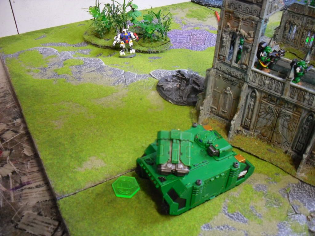 The Captain finally arrives to steal the show away staggering Dread and plops right down in front of the Broadside and peppers the Fire Warriors who seem to be using the maligned Pscho-Hallucinatory chemical weapons. Obviously the captain is keen to get to the source of this blasphemous silliness. With support fire from the Whirlwind the Fire Warrios are pined