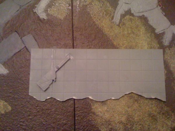 Secondly you need to modify the base if it is sitting on underneath a ruin as perfectly square floor tiles for a ruined building just doesn't fit. Get the scissors and randomly cut out parts of the tiles along the edges, you'll note it might be worth doing this before gluing seperate pieces together  . Because of the irregular angles and cuts from the scissors get the knife and smooth down the cuts. If you have any off cuts from the sheet and they are in good condition just put them to one side  .