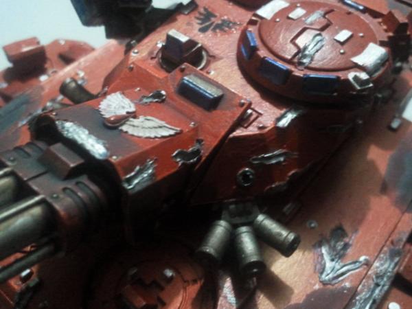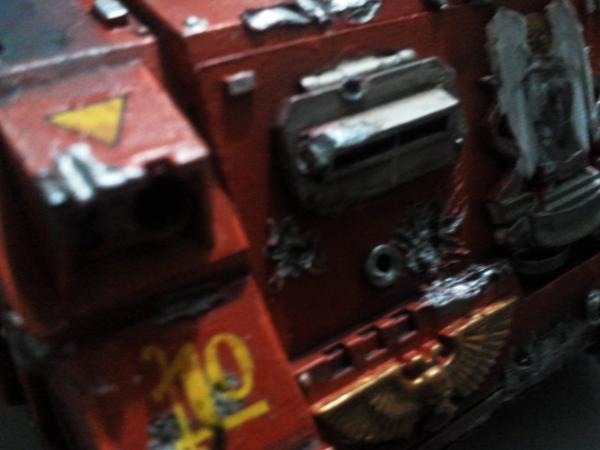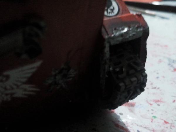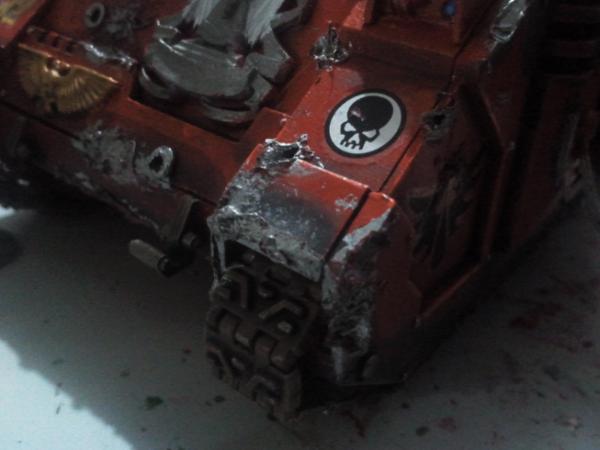 Today i was trying to use a soldering to create the effect of a melta hit, when i realized that it also works great to make scratches, bolter shots, phisical hits and almost and kind of battle damages or effects; the results are great and very realistic, and it's also very easy to do: just use the soldering like if it was a brush to "draw" holes and scratches, then paint them with Chainmail or something similar.