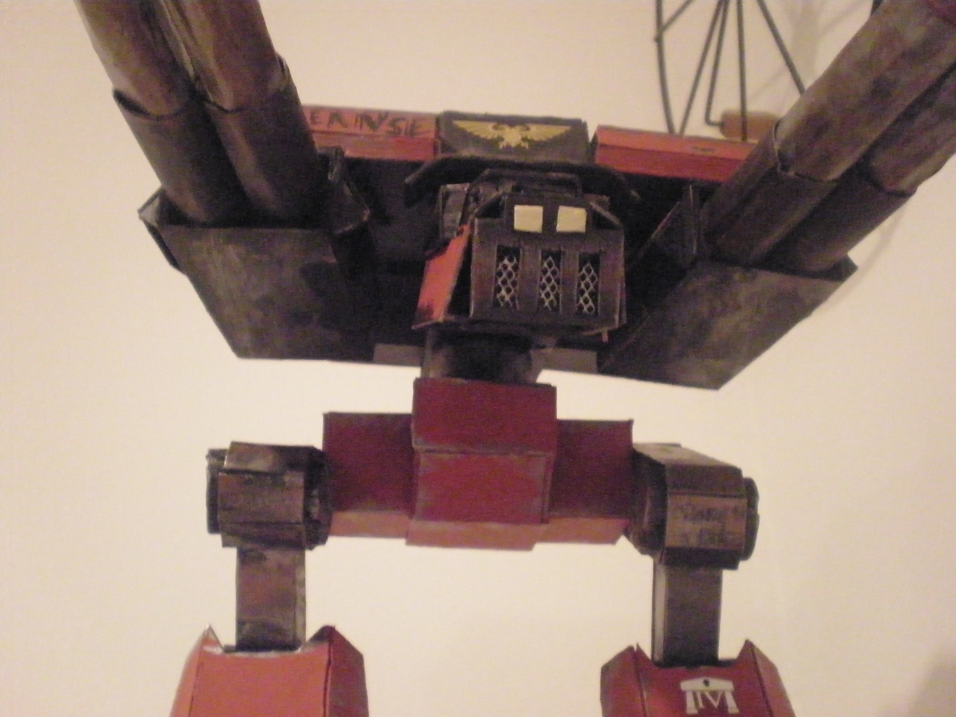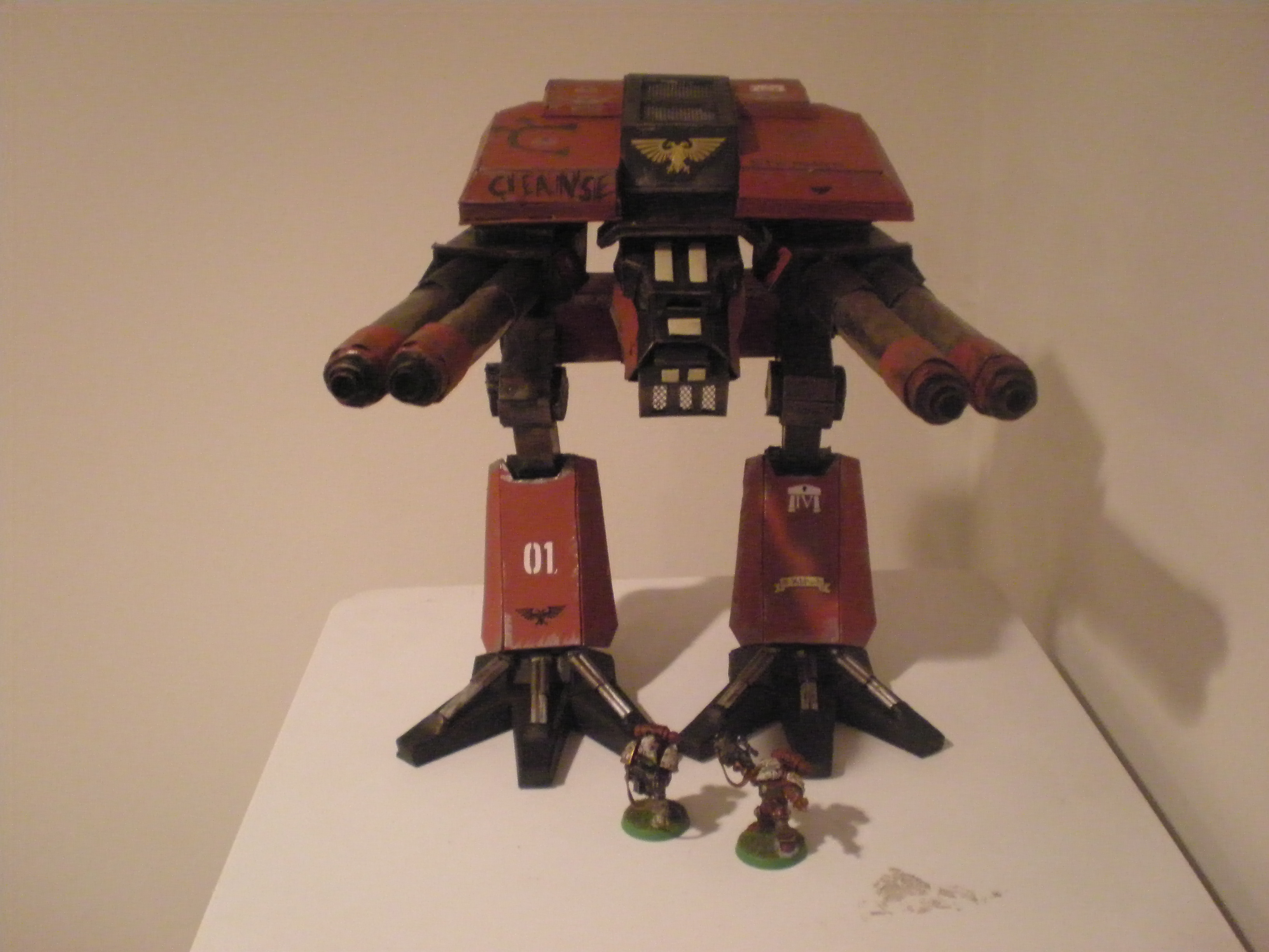 I saw scouts, then Tac marines, then terminators, then a TITAN! Talk about scaling up! Anyways, the painting looks good. I'd suggest a very delicate reddish wash on that Terminator helmet - it looks too white right now. A wash will darken it slightly and bring out the lines. The titan is a scratchbuild, right? I think the painting could use some more detail, freehand on the leg armour and the shoulderpads would go a long way if you have the talent  A super-detailed chapter symbol would be awesome! If you're good with computers, you can whip one up in Photoshop/GIMP (or Paint if that's how you roll...) and print it off on cardstock, then paste it on. Hassle-free detail and custom decals!