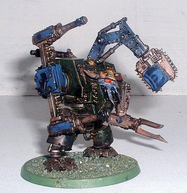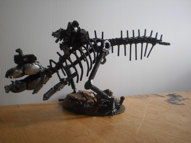 The Carniss heavy walker is a vehicle only in use by the Angels of the Dark. This mighty war machine’s plans were found many years after the founding of the chapter, in the chapters main Mechanicus Quarters. The Angels of the Dark have always been fascinated by O’ Holy Terra’s past, before the time of the Emperor. The designs are based on a skeleton of the mighty Tyrannosaurus Rex. The Techpriests however discovered an ancient version buried in the bowels of the Angel’s Fortress Monastery. When studied, the Techpriests decided that it was fit to be mass produced. The Angels have won many battles with this particular weapon, especially against Kroot heavy Tau armies. The Knarlocs, similar in shape have often confused these machines as their one of their own, and have been slain as a result.