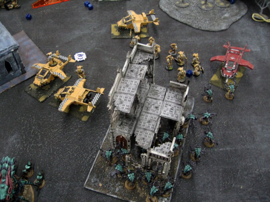 Turn 5 BA: Mephiston casts wings and flys over to the wounded tervigon in mid field. Devestators cause 10 wounds to the squad of 17 guants in the back. The assault squad charges in to help the librarian unit out. I lose the priest and 6 guys out of the librarians unit but wipe the genestealers out. I consolide the librarian and unit on the objective and the assault squad around the objective. Mephiston kills the tervigon. Psychic scream kills some gaunts from the nearest unit that was sitting on an objective. They fail moral check and fall back. Baal Preadator moves fast to contest his far objective.