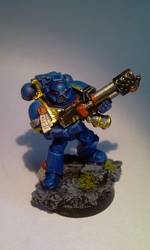 I started painting only at the beginning of this year, during a period i was sick at home and i really needed an hobby other then watching TV, reading or playing videogames, so my girlfriend picked up a starter box with space marines. You know, 5 marines consisting of 3 parts and 5 colors of paint. I looked up a tutorial on how to paint Ultramarines (on the GW website) and together with the painting instruction on the manual in the box, i created a marine that looked like I've painted him with a paintballgun.