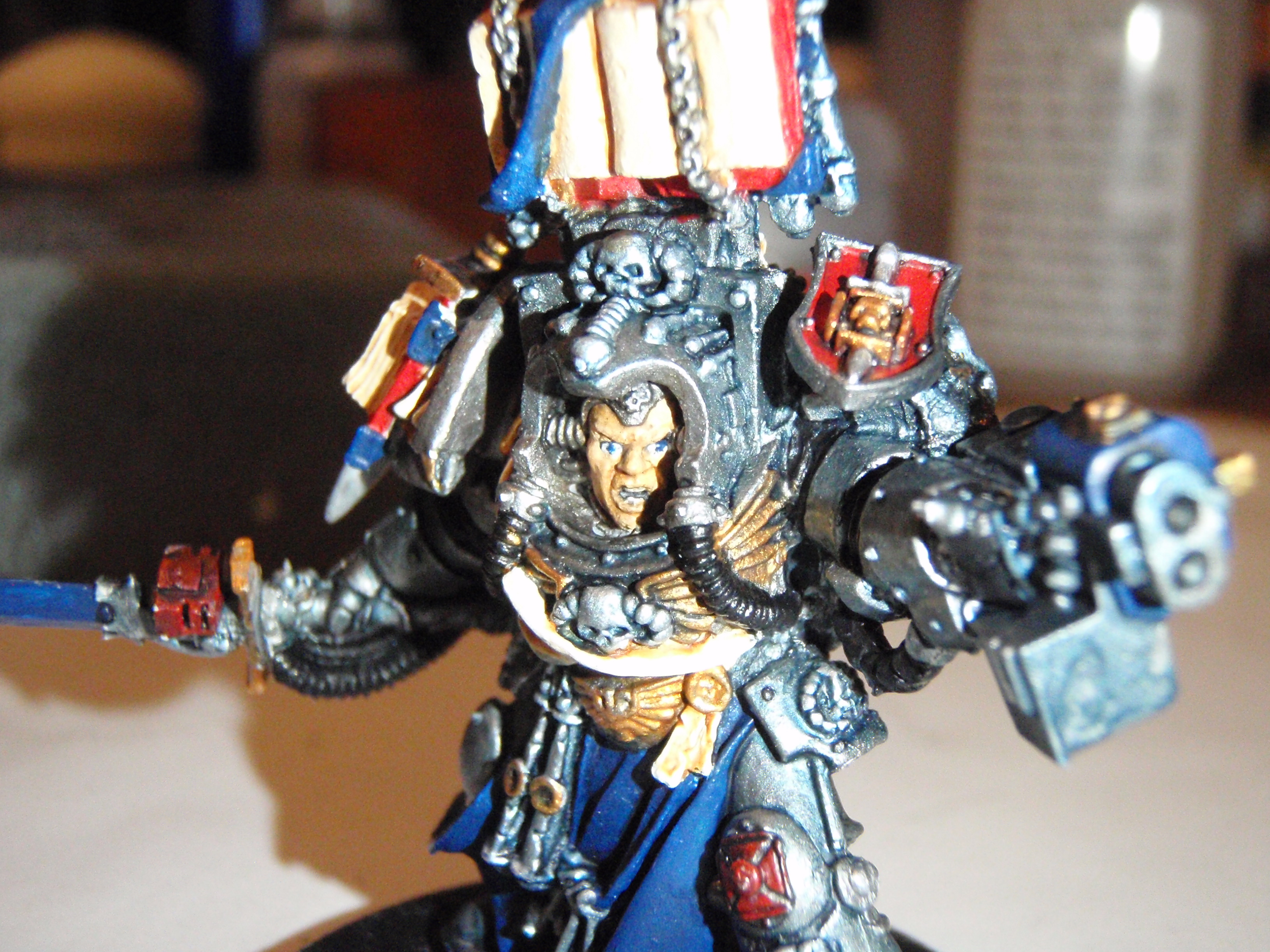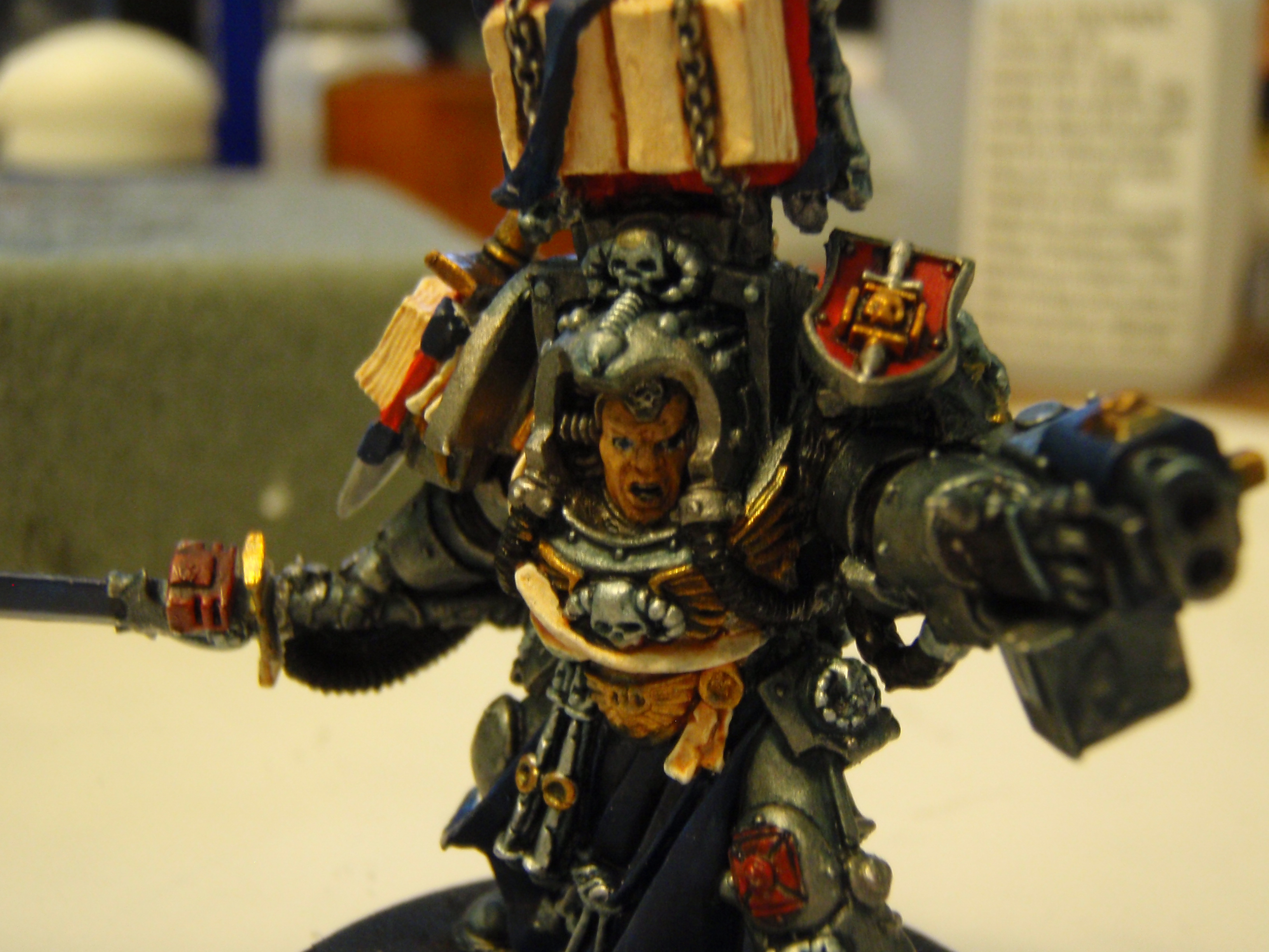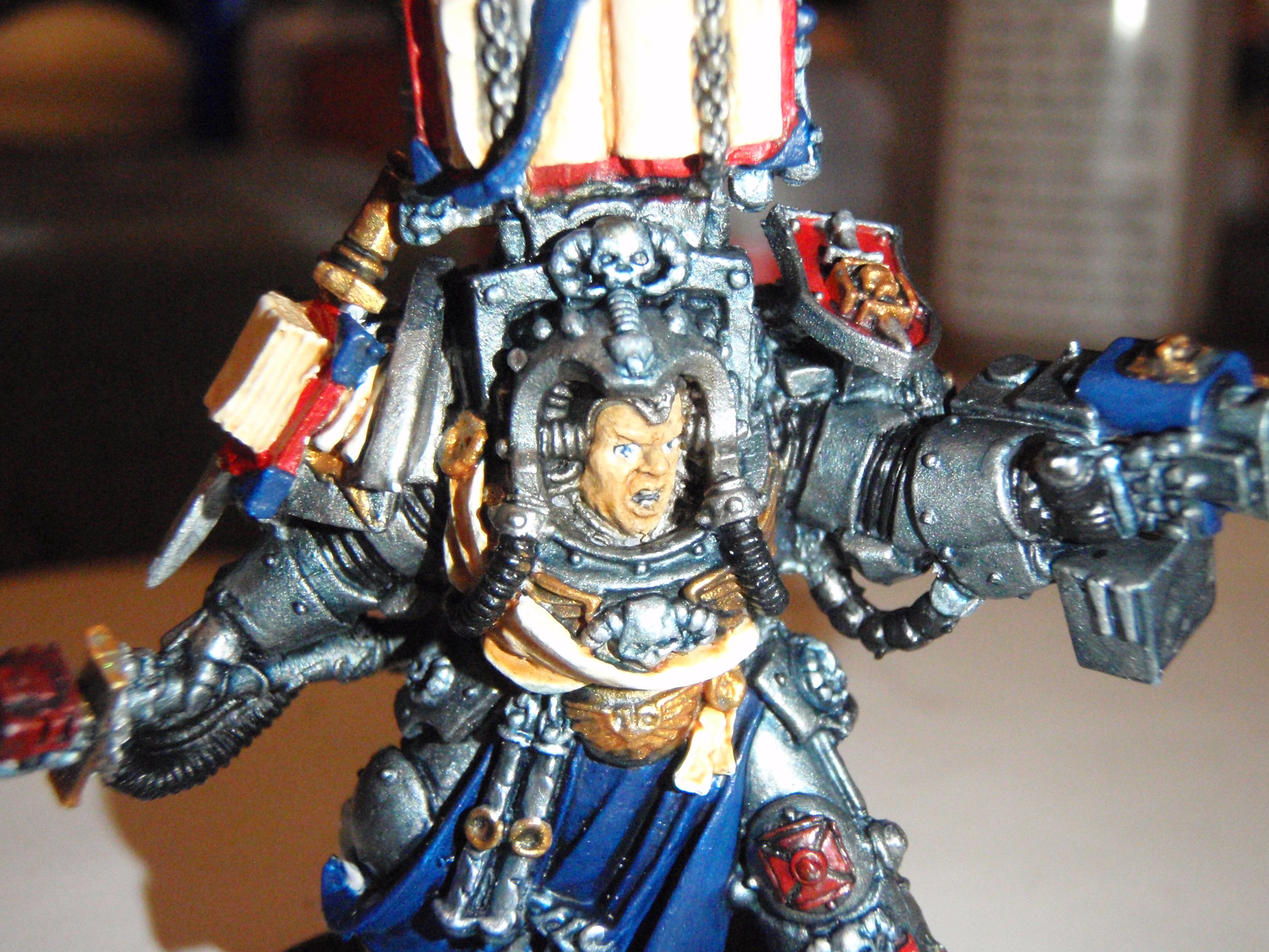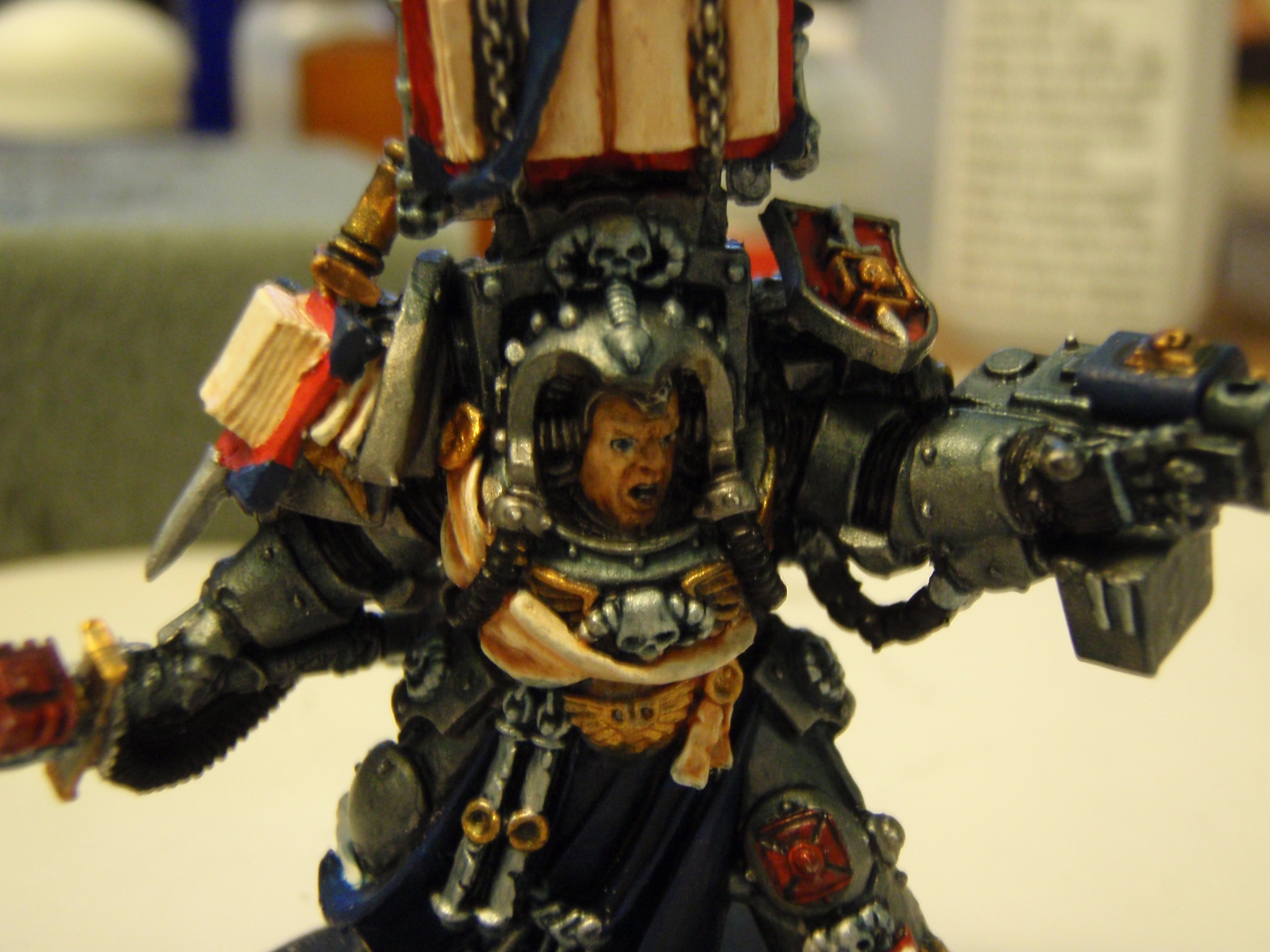 I actually did give the Librarian's face a very thin layer of gryphonne sepia, I think the camera's light overpowered it. I wash a 3:2:2 mix of asurmen blue, badab black, and water over everything to give it a sort of blued steel look, and felt that it did the recesses well enough. If it's not even visible here, I suppose a second application of Black wouldn't be out of place.