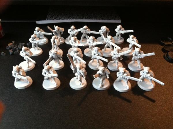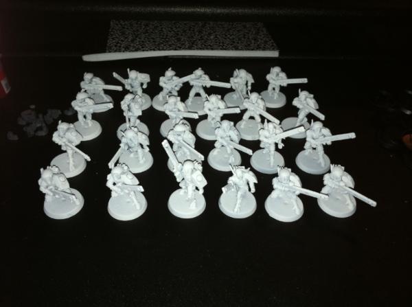 After a bout with some technological difficulties (my motherboard on my desktop died, my laptop got a virus that wiped it clean and I had to reformat, and my cell phone/camera broke) I managed to fix two of the three, as well as continue my work on my Fire Warrior Squad. I ended up purchasing a Tau Battleforce and adding another 12 warriors to the original twelve. I'm still not very far along, but I plan on taking up the majority of my night trying to figure out how to do this whole painting thing.