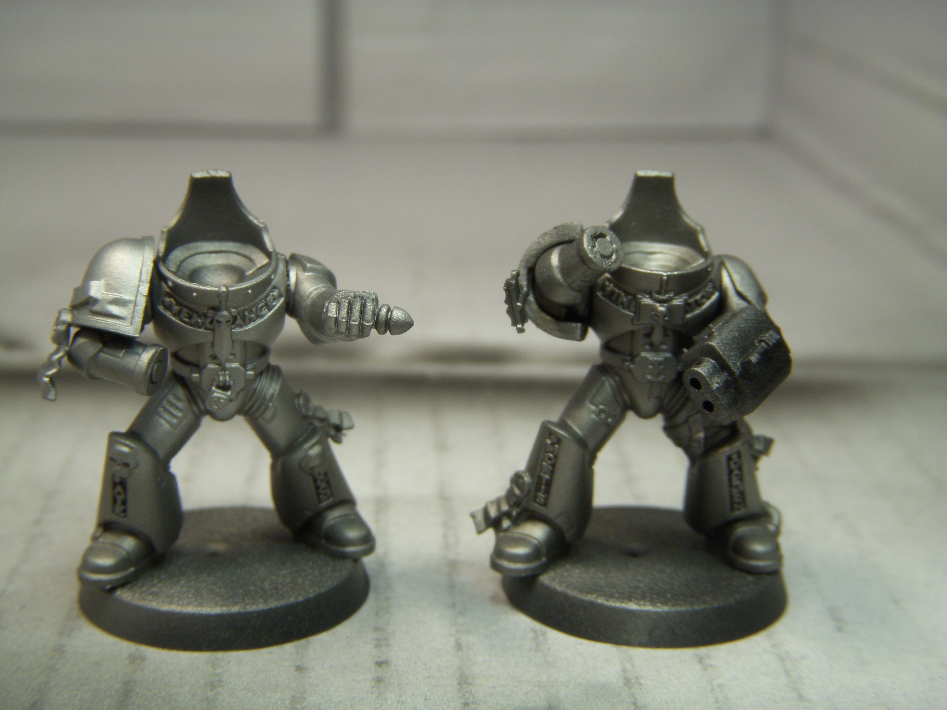 Ok folks! With my weekend finally here I've managed to get a little more work done. Today, i've Magnatized all the Halbreds and Flamers on my little plastic men. I've got a few picturs of before, Primed black, and then coated with Bolt Gun. I've also added a pick of why i Put Chainmail on them. It gives them that polished shine look to the Boltgun armor. :-) The GK on the Left has the Chainmail addition.
