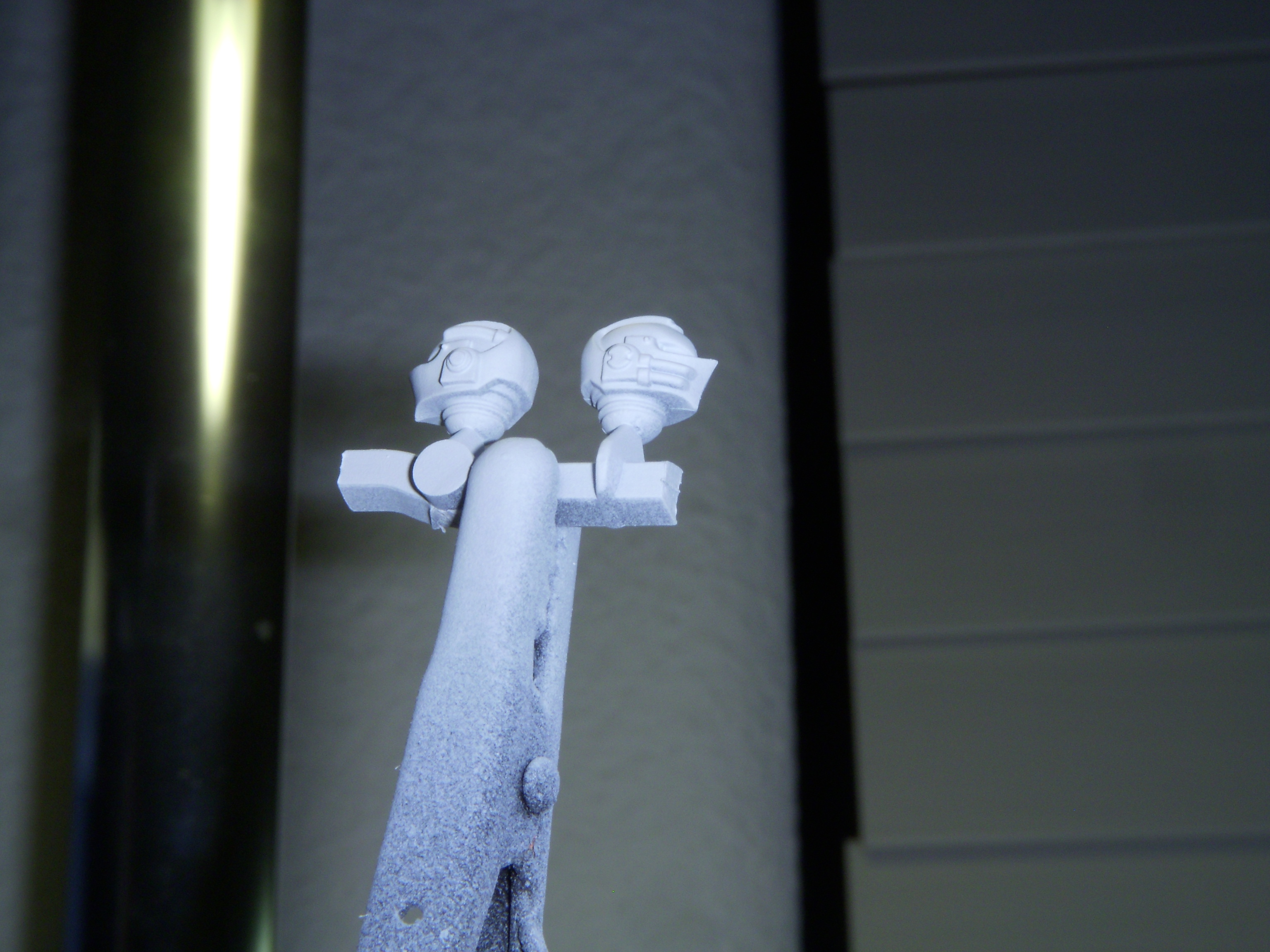 after the black primer i used the airbrush to put on a solid coat of Boltgun metal. i don't use exact measurements so i can't tell you what the mixture of paint to water ratio was for the airbrush. i just know more paint than water. if you gett it too watery, it won't coat like spray paint, it'll blob up with silvery watter droplets.