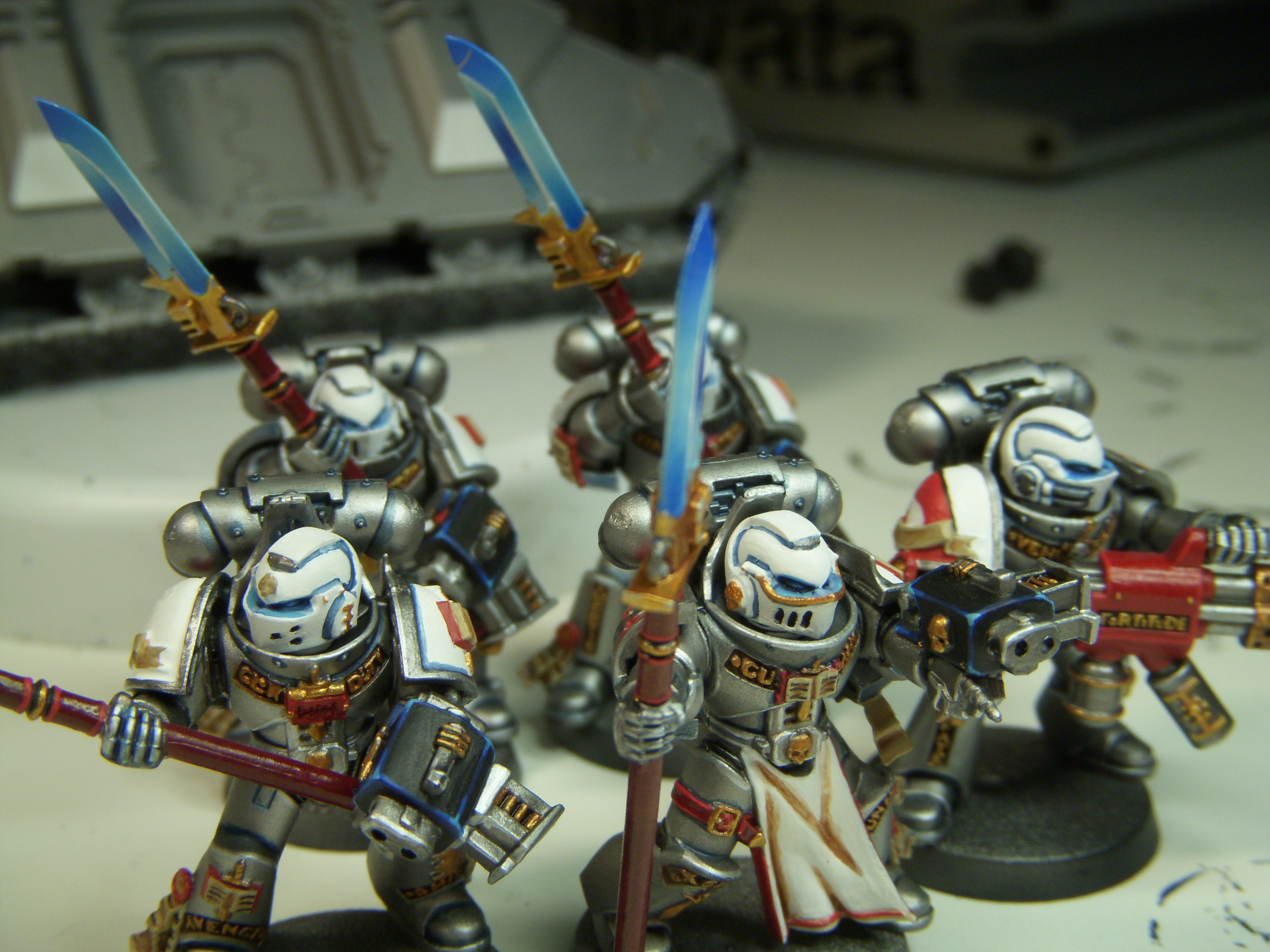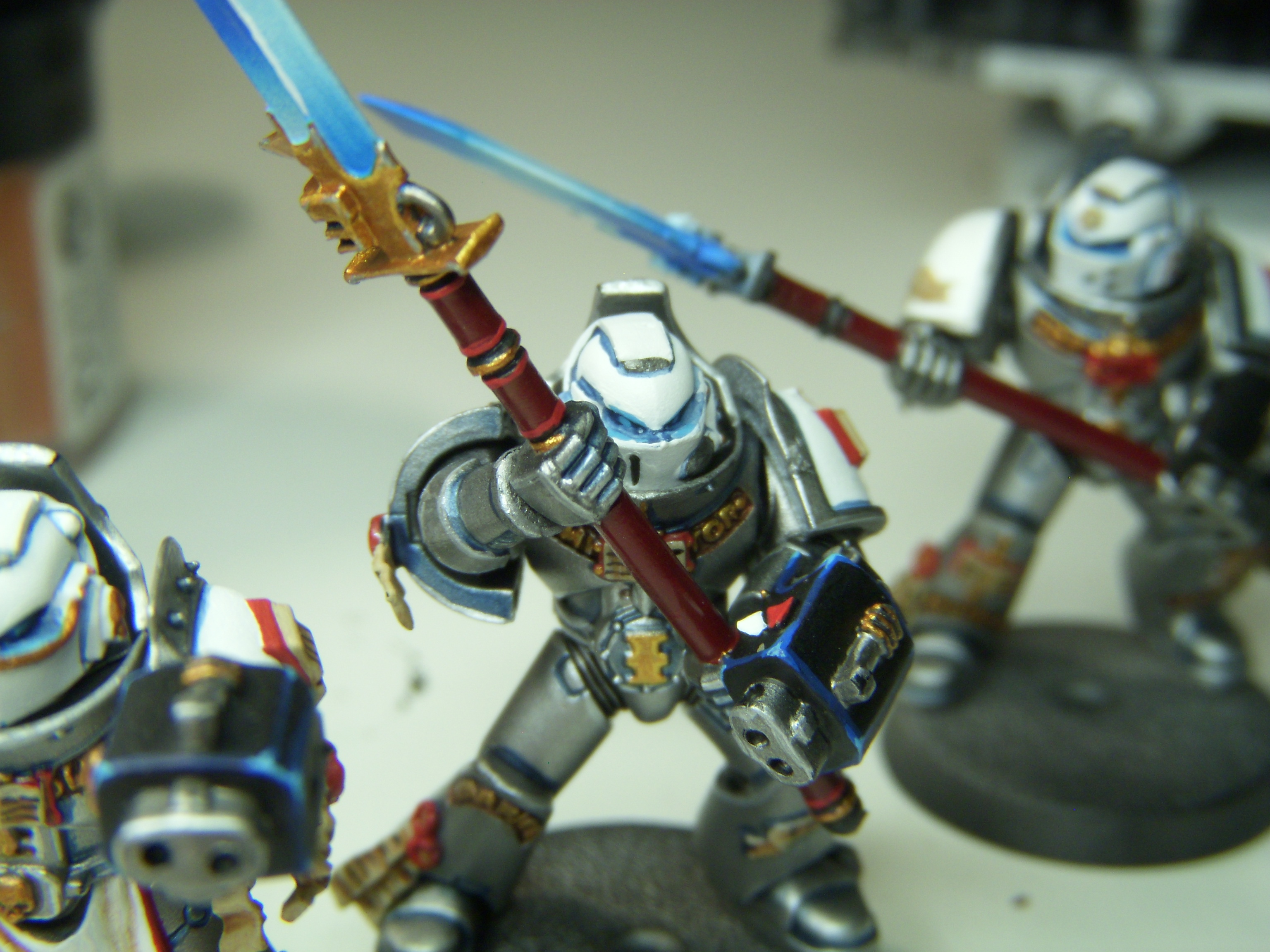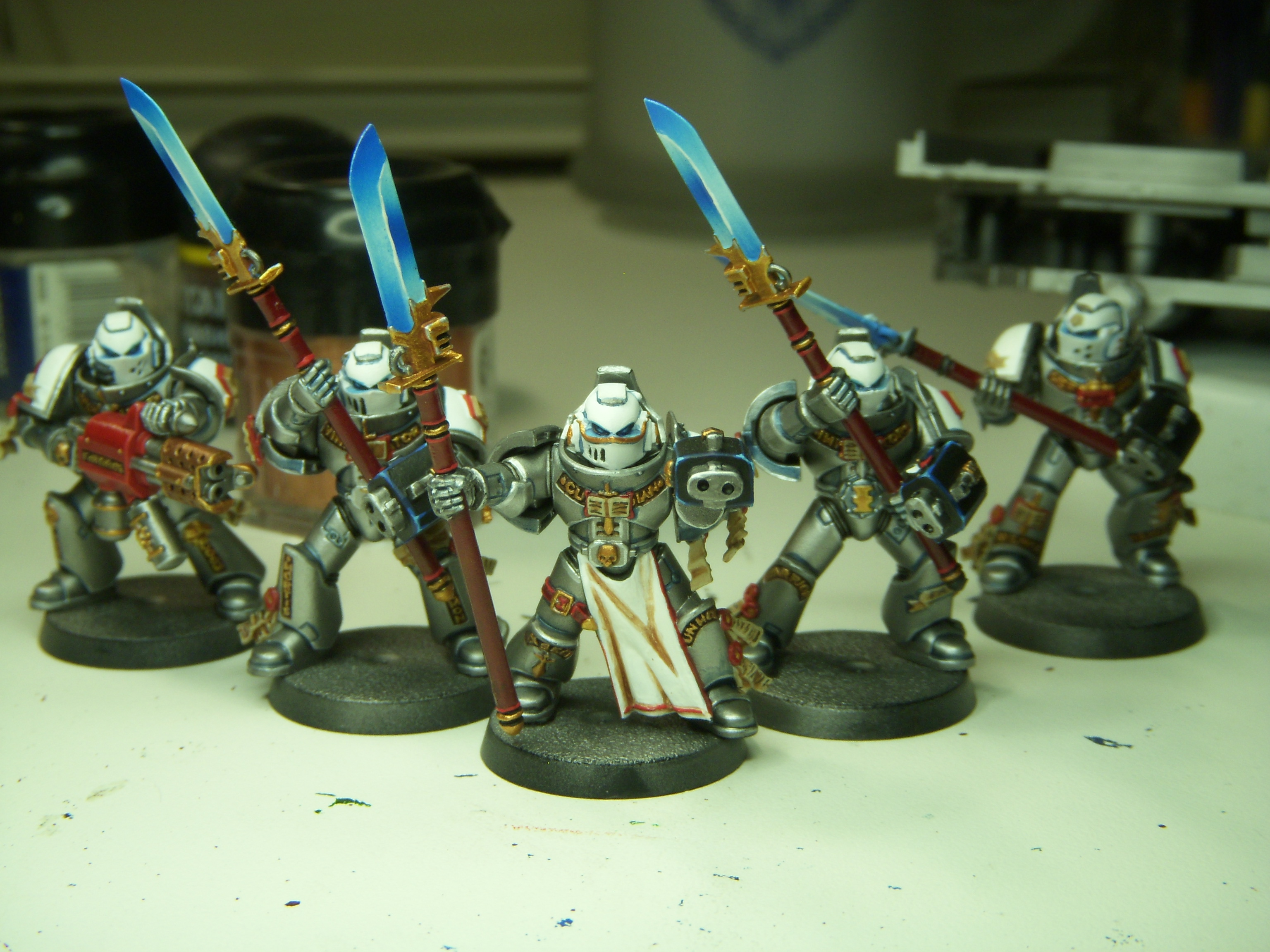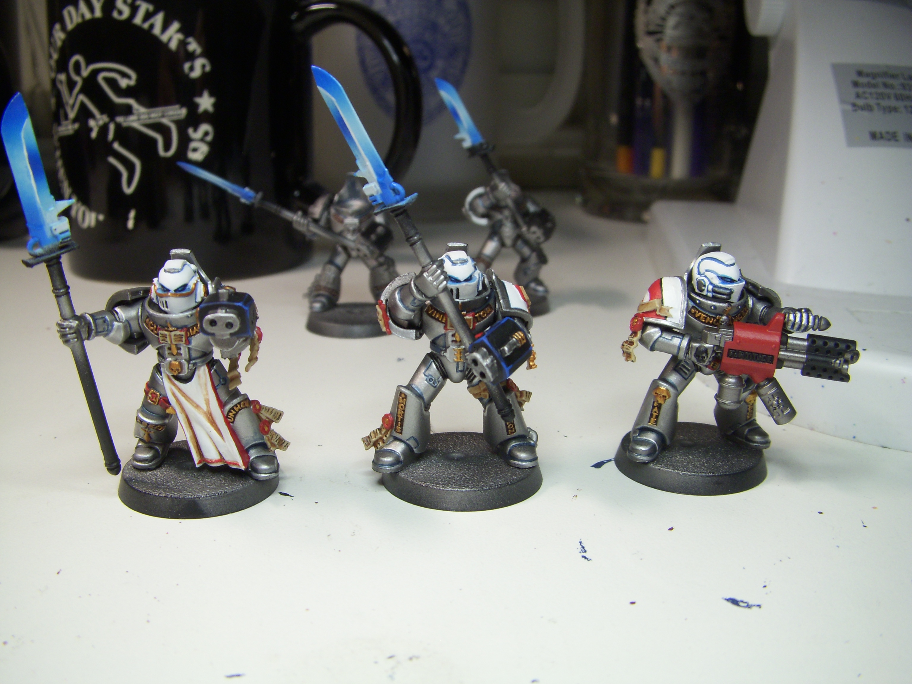 Thank you! I'm also open to any good ideas for basing! I'm at a loss at how i want to base them. theyre going to be a small elite army so buying resin bases for the whole thing isn't out of the question. My first knee jerk reaction was to go with Grey slate or even snow covered but at this point i'm open to any suggestions. :-) Oh, the power weapons (Which should hopefully get done this weekend) will be the White faded to blue faded to black like GW has it. with the air brush it's very simple to get the gradual shaded look. I'll post the Link to the freakin Kick butt Youtube video on how to do it when i find it!