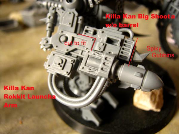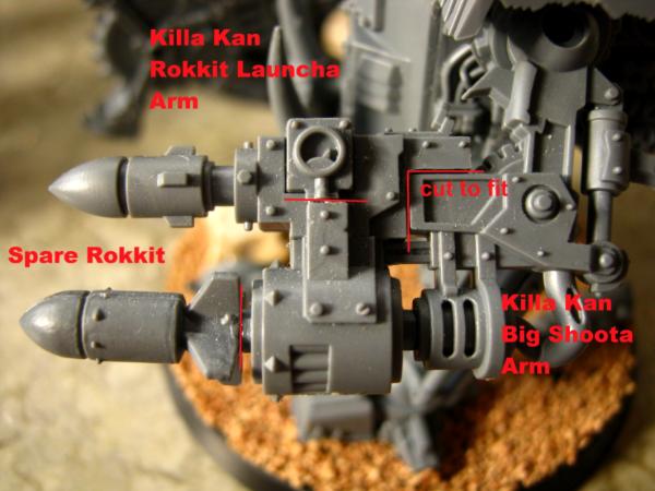 I simply attached the big shoota gun part to the rokkit launcha arm, cut off the barrel and glued one of those random spikes from the deff dread kit to cover up the bare spot. This one's not my favorite (the top still looks like a gun), but it gets the job done.