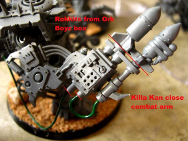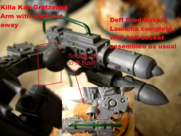 This one involved the most cutting to fit the rokkits on the arm. I took the grotzooka arm from the killa kans and cut off the stick. Then I took the ball for the dread socket and cut it flat so it could lay flush against the grotzooka arm (see the inset pic above). Then I cut the back of the rokkit attachment so