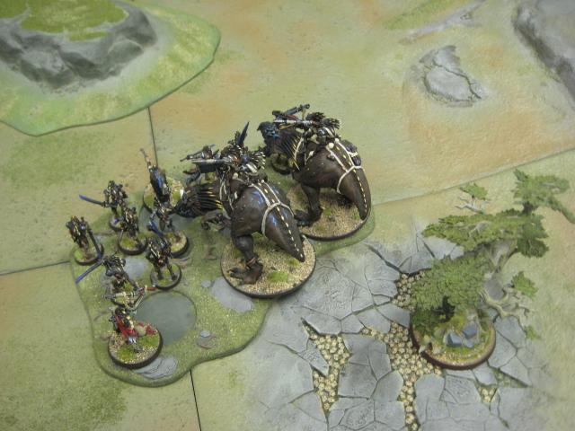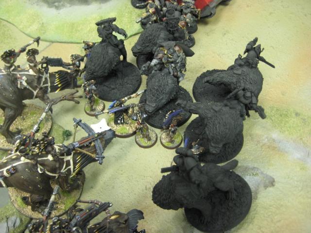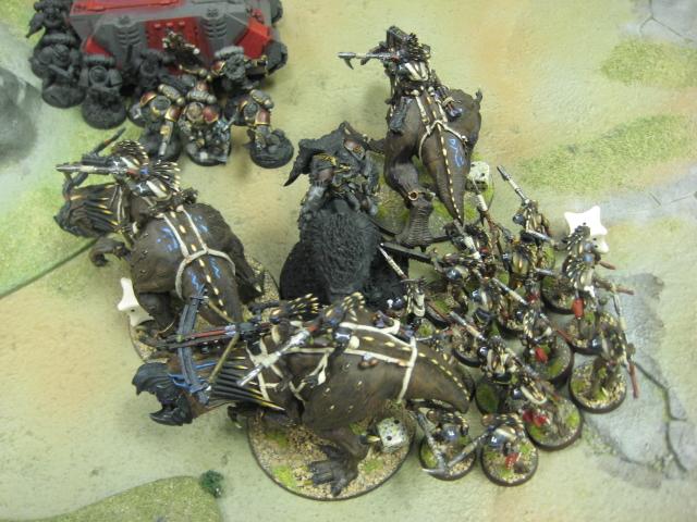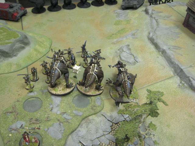 Courtneyfro and I set-up a 1500 point game so that I could make an attempt at my first battle report. I will be using my Kroot counts-as Dark Eldar, and he will be using his Space Wolves. I’ve fought against his army a few times already as my webway portal list has begun to evolve, and I’ve never been able to beat his thunderwolf cavalry. In fact, I haven’t even come close. My army lacks any shooting, and wyches and beasts are simply too weak to wound those wolves in assault. I have had the most success with talos attacks, but even they are ripped apart rather quickly if they are thrown into the melee without any support. Still, I would rather have a talos in assault than out in the open when I’m guaranteed to be facing long fangs as well.
