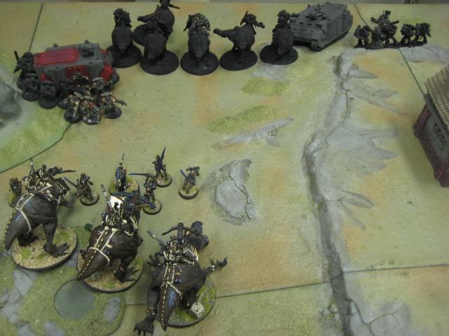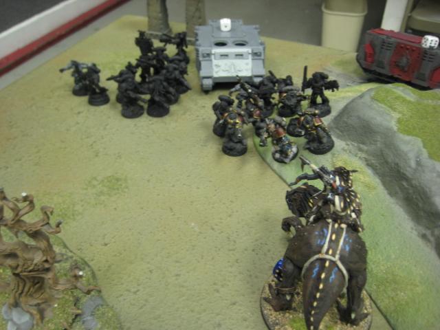 The marines grab the reins of their wolves and… run away? I didn’t expect that, Courtney is usually all too happy to get his cavalry stuck in. Instead it’s a tactical retreat with everything, forcing me to advance out of the woods if I want to assault. The rhinos and long fangs all fail the range checks to shoot at the harlequins. The speeder does approach my right flank and take a pop shot at my lone haemonculus, but rolls a ‘1’ to wound.