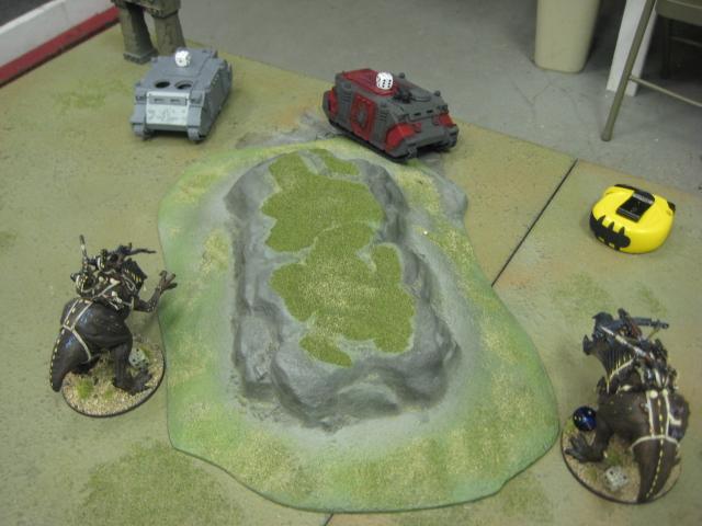 BRB- “All monstrous creatures have the ‘move through cover’ special rule (see page 75). They simply bash their way through trees and ruins!” The exclamation point at the end of the second sentence pisses me off. I manage to shake the speeder and the rhino near the long fangs with shots from the haywire launchers.