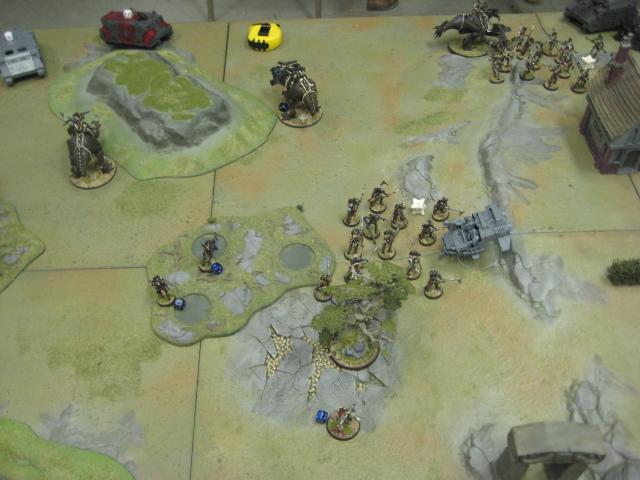 Lots of ineffectual shots from rhinos do nothing except break some branches and scare away the local fauna. Then the long fangs aim at the nearest Talos and hit with five kraks. Wound rolls- 4, 1, 2, 1, 2. Hah!