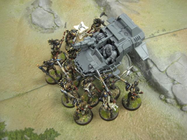 My army all advances towards something. Two talos head towards his objective, guarded by two rhinos full of grey hunters. One talos and a wych unit run towards the other rhino and the long fangs, and the last wych unit decides to test out their haywire grenades on the speeder that just rotisseried two of their buddies.