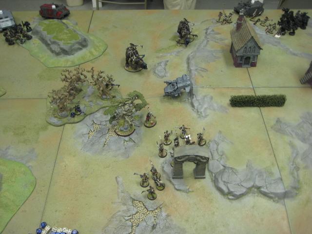 I feel pretty good at this point. I will have Vect and 3 Talos in assault with his thunderwolves this turn, so their high toughness will not matter. The leaves of the webway portal begin rustling, the wyches have arrived. A billion chickens come screaming out of the portal, two turns later than I would have preferred.