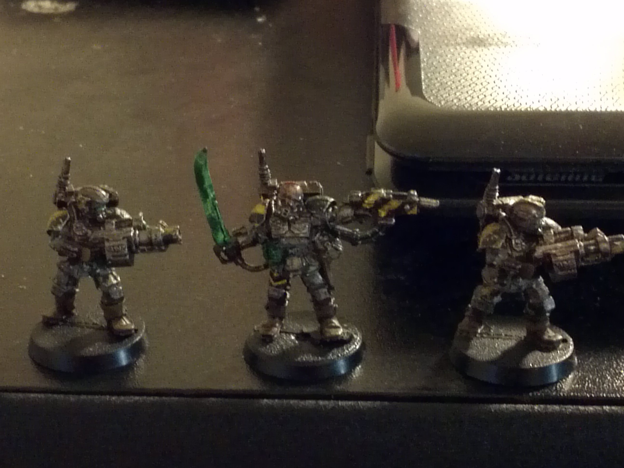 I think applying a lot of washes to the metallics, and at least one stage of highlights to the solid colour would make the overall effect much better!