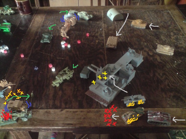 Then H moved his amour up and blew the turret off one of my tiger tanks and immobilized my beloved panzer! But not before i'd shaken his churchill and stunned his shurman!(some constellation pfft). Our artillery traded blows, mine immobilizing one of his trucks. His other moved to the guns and the troops jumped out. while mine stayed in the amoured cars. H moved his repair truck upto his immobilized truck and attempted and failed to fix it on a 6+.