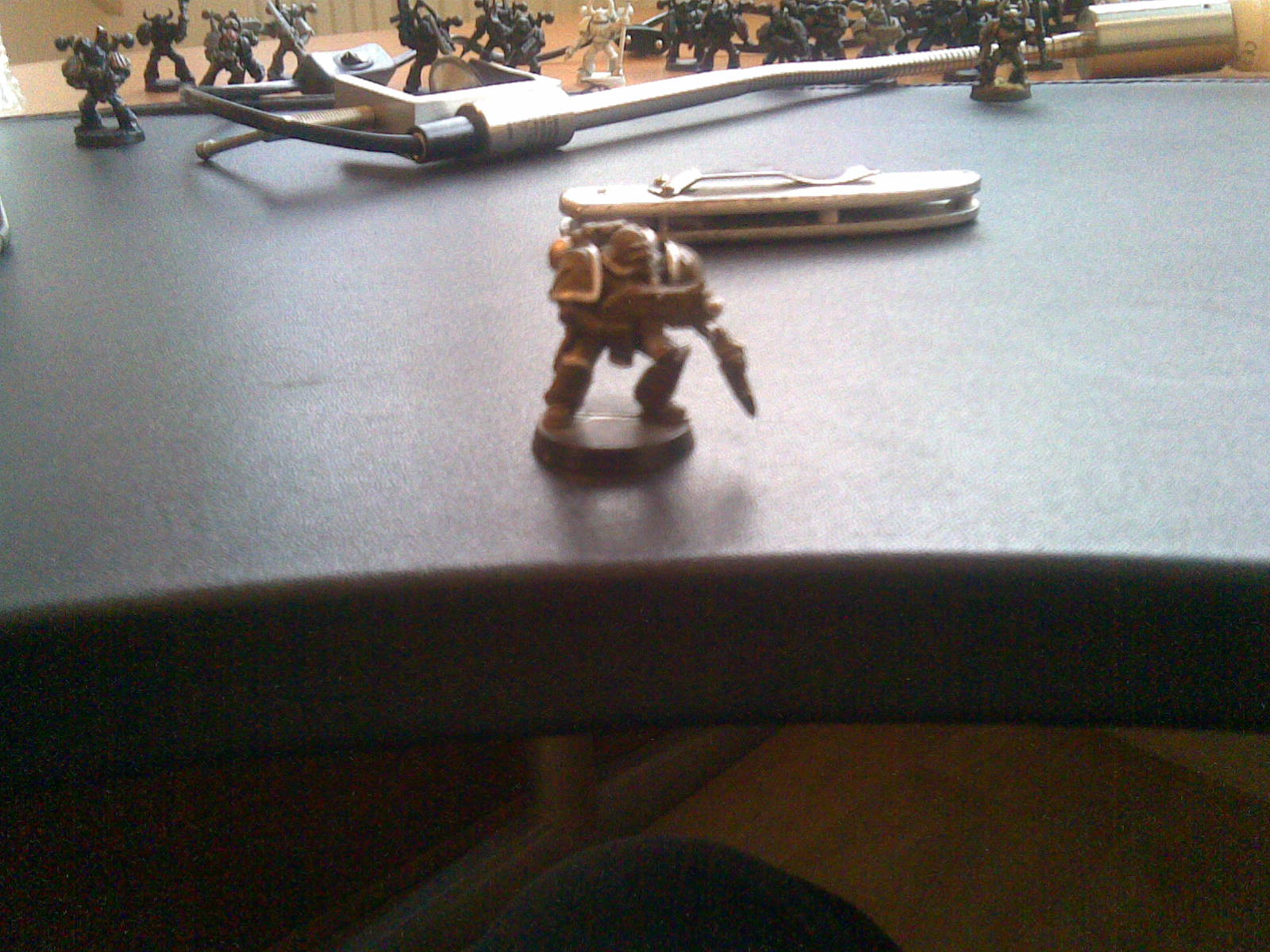Hard to tell because of the blur...but it sort of looks like an older Plague Marine with the spike broken of the helmet...