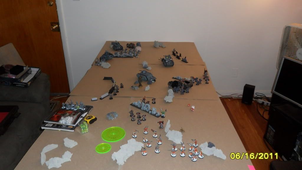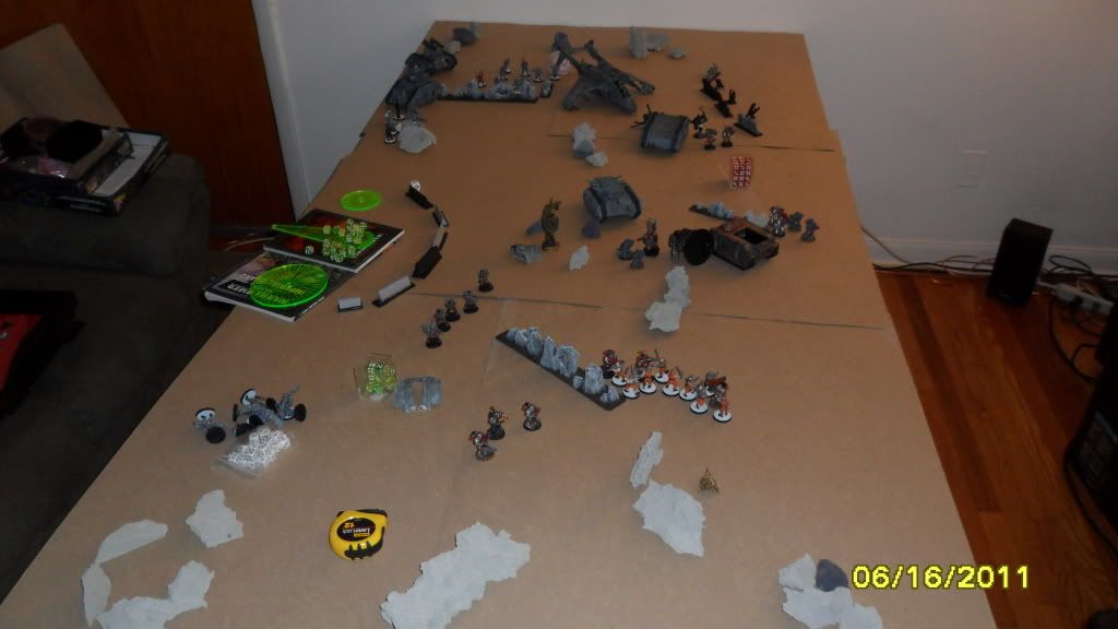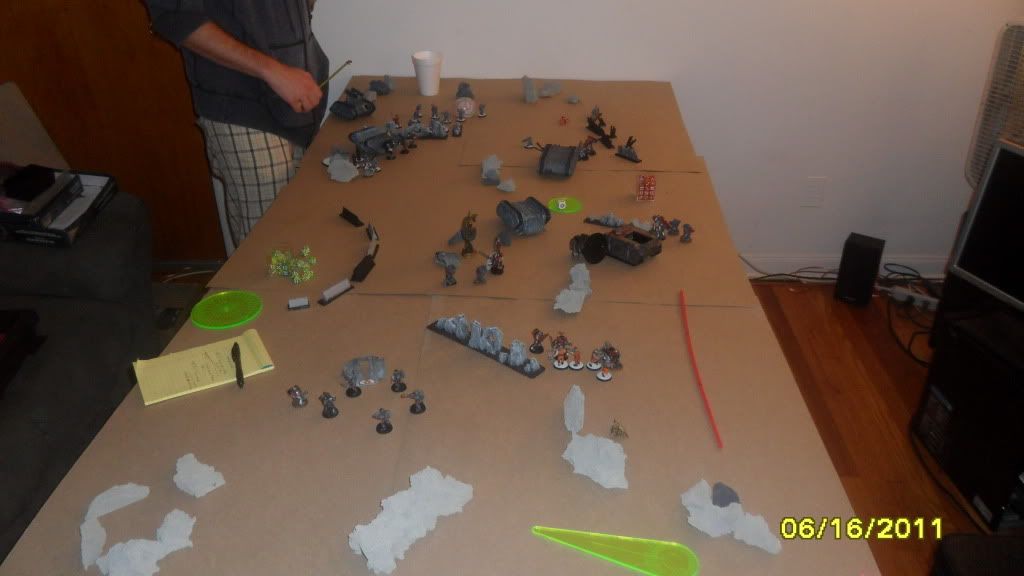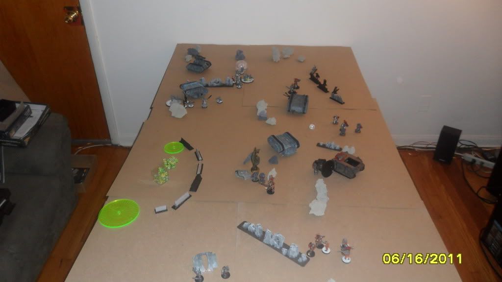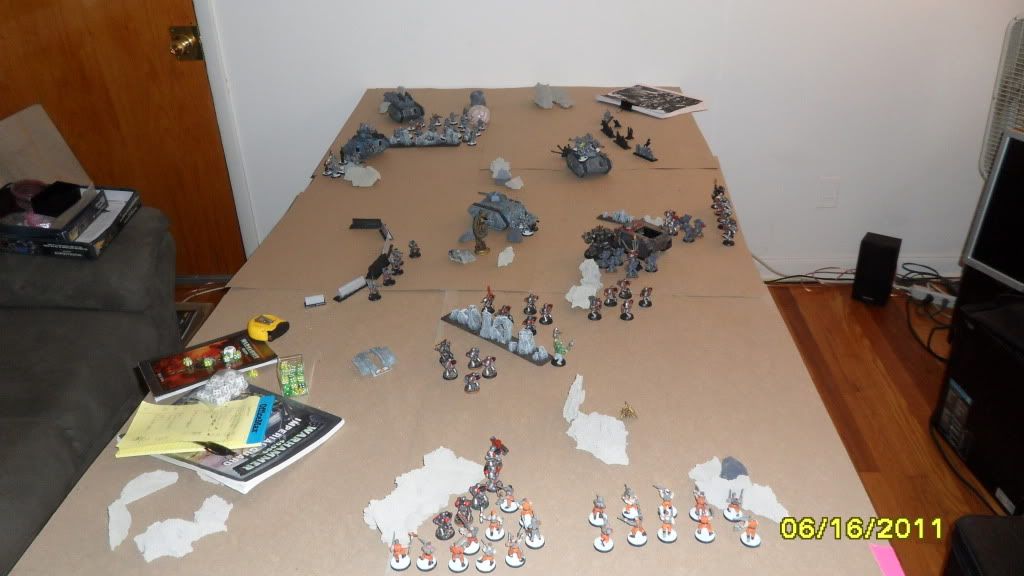 The game ends with his marines holding one objective and contesting my one. His marines fail to finish my one remaining Penal Legionnaire.