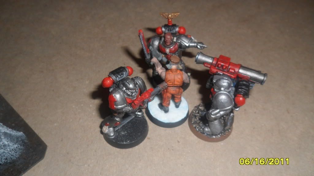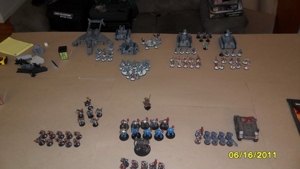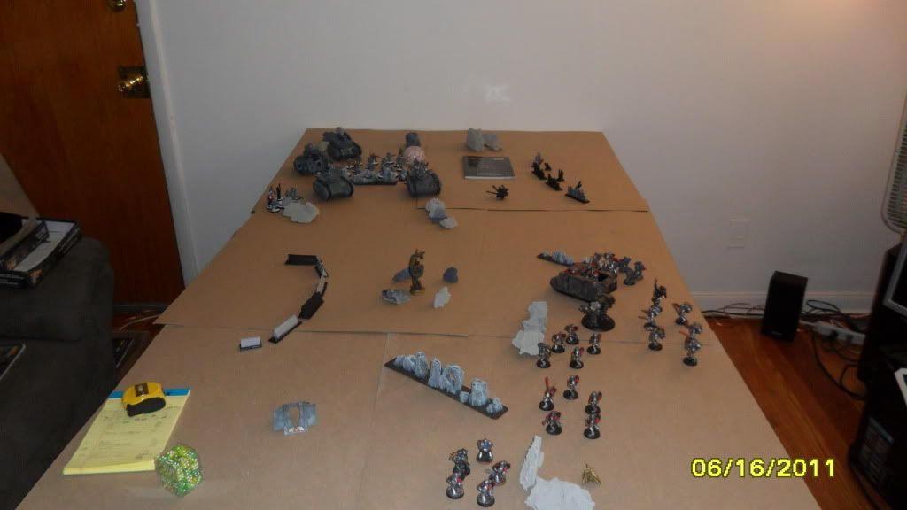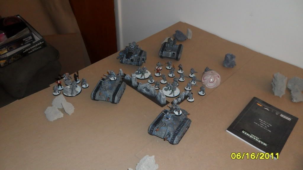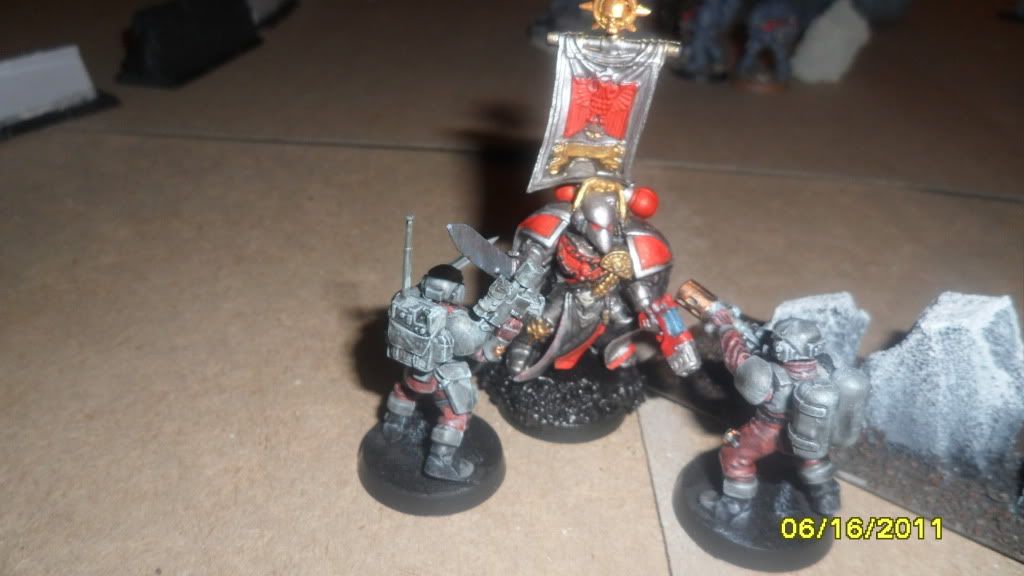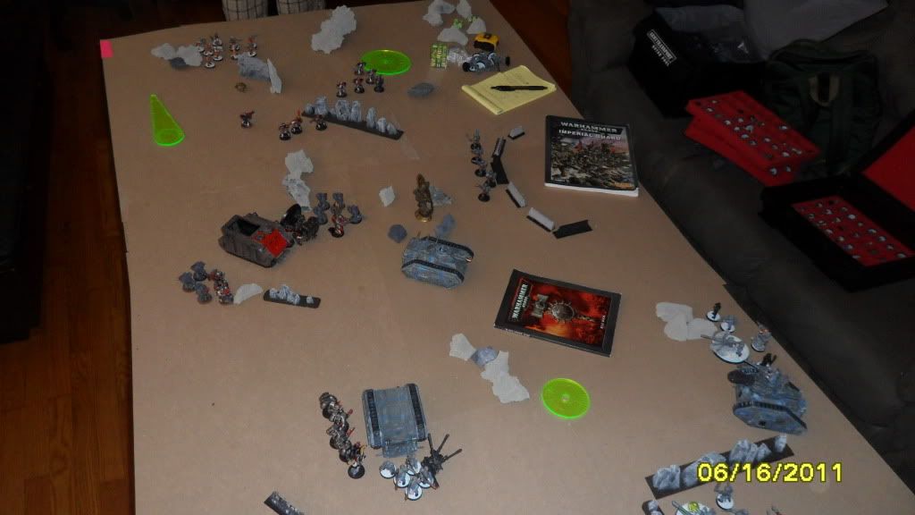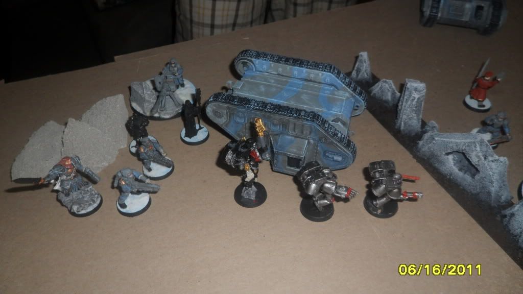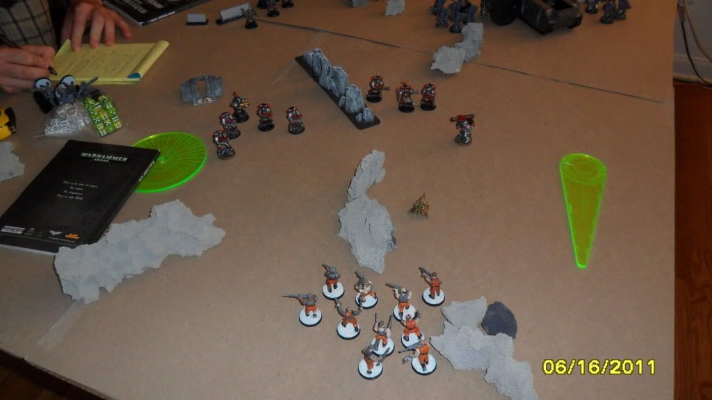 One of Mikes Terminators comes in by the infantry squad and fires on the blob with frag and storm bolt guns, killing 9 of the 20 guardsmen