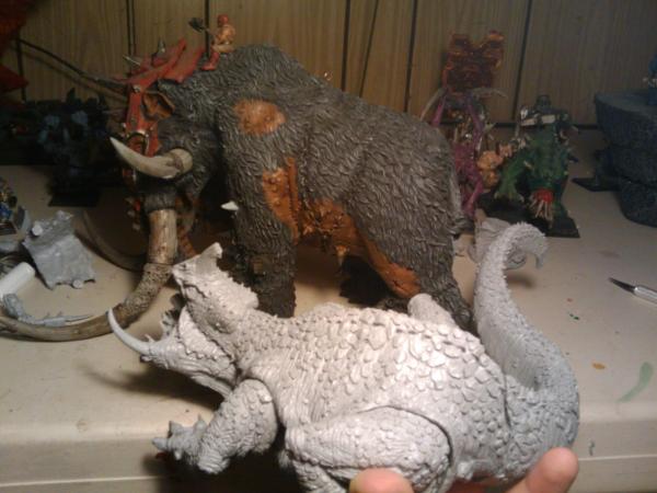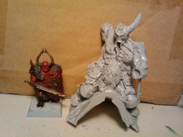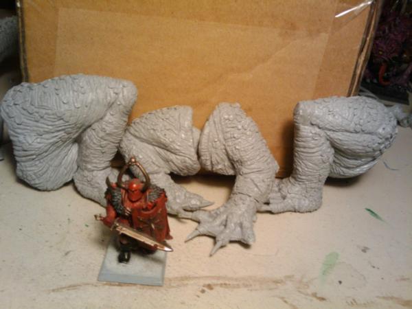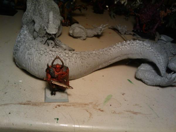 Glad to see everyone likes the model, I know there was alot of people who were iffy about it. While putting glueing on the second leg I ran into a bit... well alot... of trouble. Without realizing it I picked up the "super thin" super glue and proceeded to use that, still not realizing it. As soon as I turn the model over, the glue spewed all over the toad dragon, covering alot of the top where all the scales are, in the front of the chains. Luckily enough I was able to quickly get it under some water before most of the glue dried and after a quick scrubbing with a toothbrush and soapy water (I doubt the fact that it was soapy made a different) most of it came off so I got pretty lucky there. However There was one area that decided to get a bit of trouble, and Im not sure how much more I can get off. I think it should be fine, and if nothing else I have some tricks up my sleeve to fix it. Here are some more comparison pictures just to give everyone an idea of how crazy this thing really is.  I'd just like to point out that his axe is almost as big as a Warrior...
