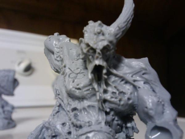 It's definitely a beast, and I can't wait to have it fully painted. It should be fully built and the base should be done today, and I might even start painting but we shall see. Im most likely going to paint the Toad in my normal WoC Troll colors, that being a somewhat dark fleshtoned skin and red scales. And Tamurkhan will probably be a very pale color or green, maybe both! What does everyone think of that? Heres a picture of a Troll so you know the color scheme Im talking about... At any rate, heres a few more pictures of Tamurkhan and some of the amazing details that stand out to me! Two nurglings hangin around the throne.  A giant gash in his side thats pouring out maggots, when I saw thing I flipped out just because of how awsome it is. You can also spot a nurgling hanging from a skull.  Hes got a small clawed arm growing out of his side, cant be healthy.  A simple picture of his grotesque face.
