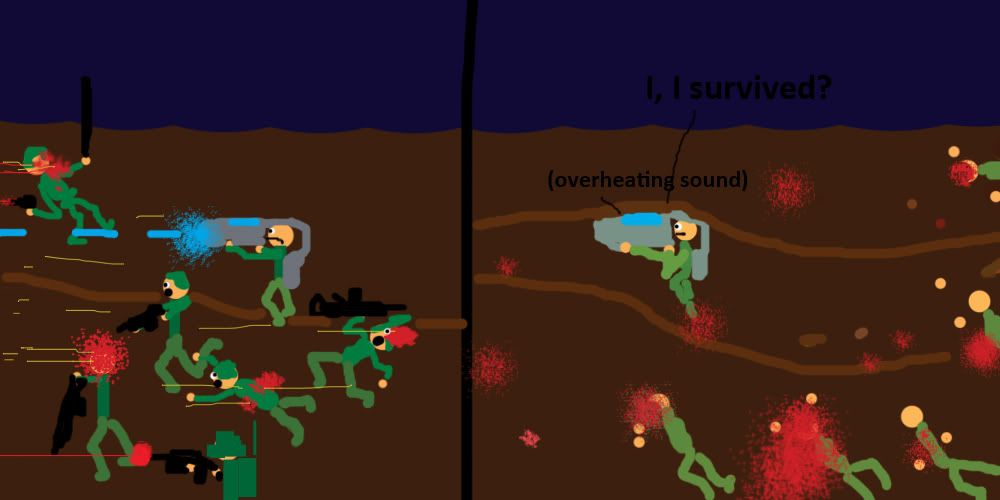 It could be better if you showed the gun turning red, and said it was making a "fzzzz" sound. At the moment, no offense, but writing "overheating sound" is a bit underdramatic.