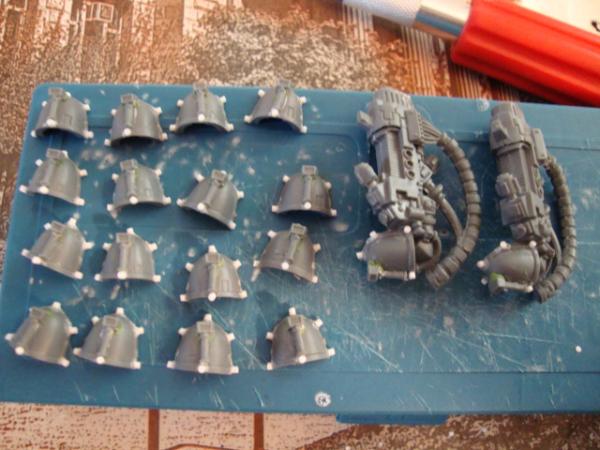 The shoulder plates for squad hammer. Shortly after completing the first squad, I found a much better way to do the rivets. I did, however, want my squads to have a uniform look. I stuck with the original plasticard dowels.