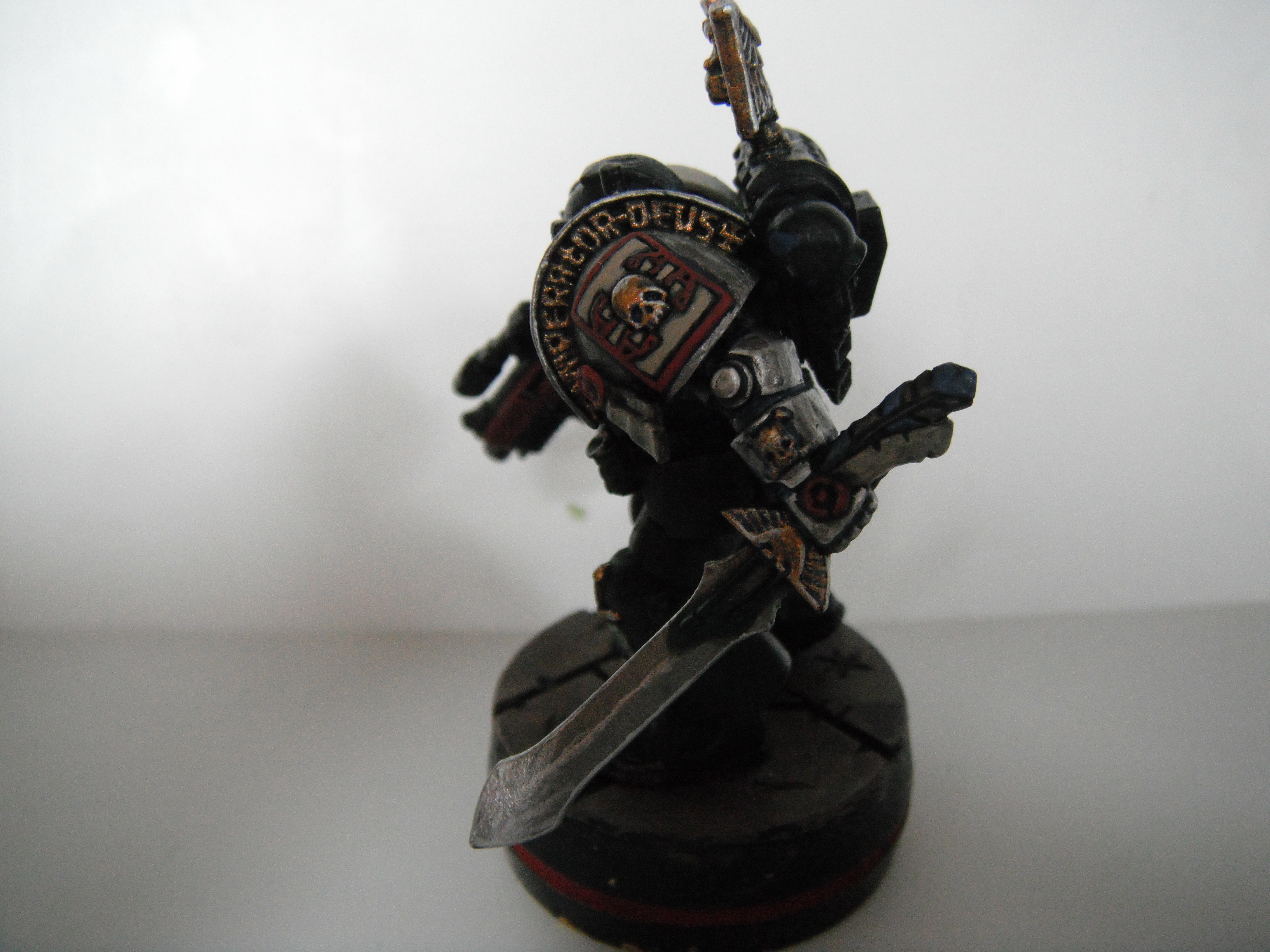 The left shouder pad shold be similar to GK,with engraved script.The Icon is the top 2/3 of the Inquisitorial I thing,with a gold skjull and crossbnes over it.