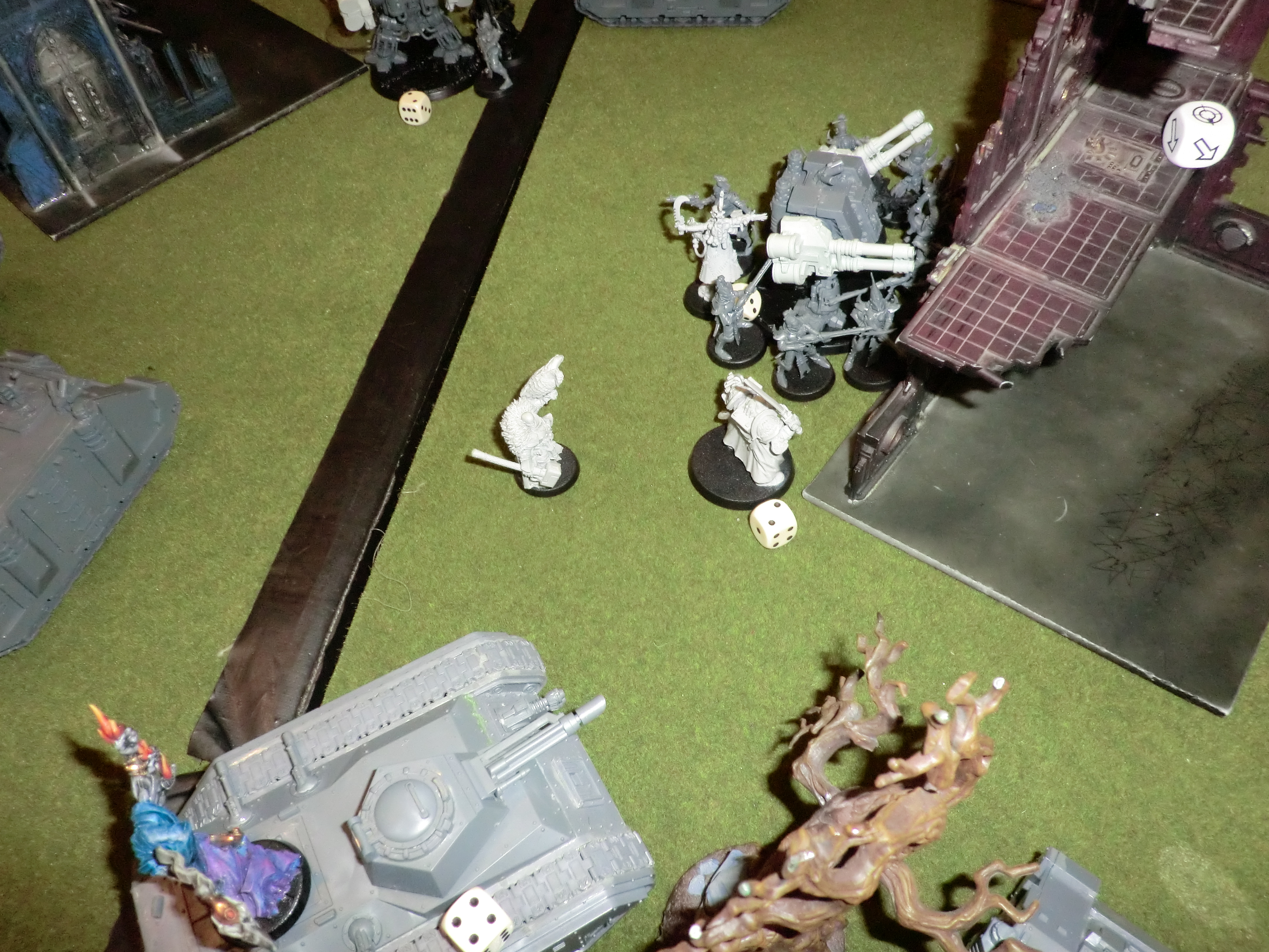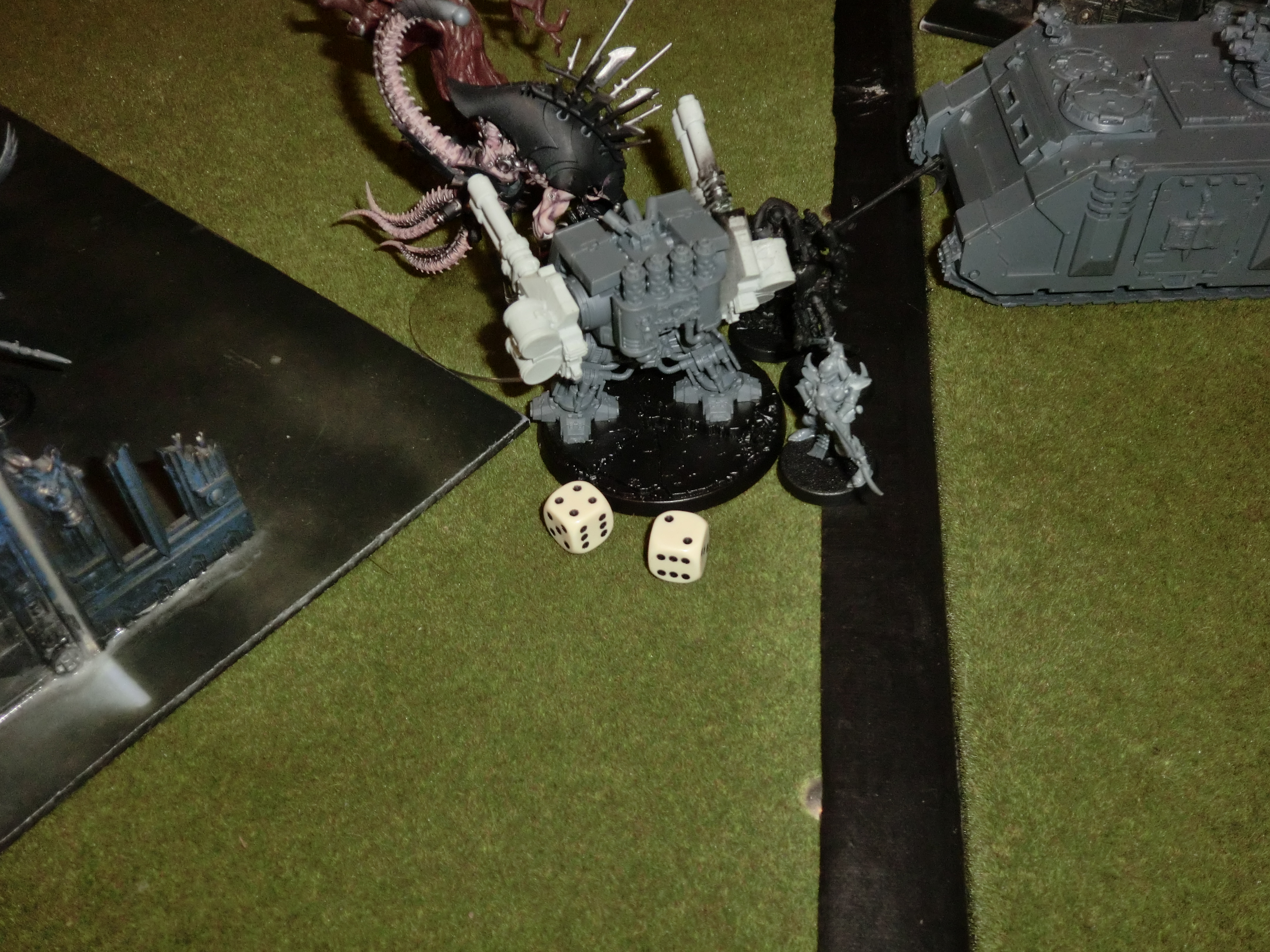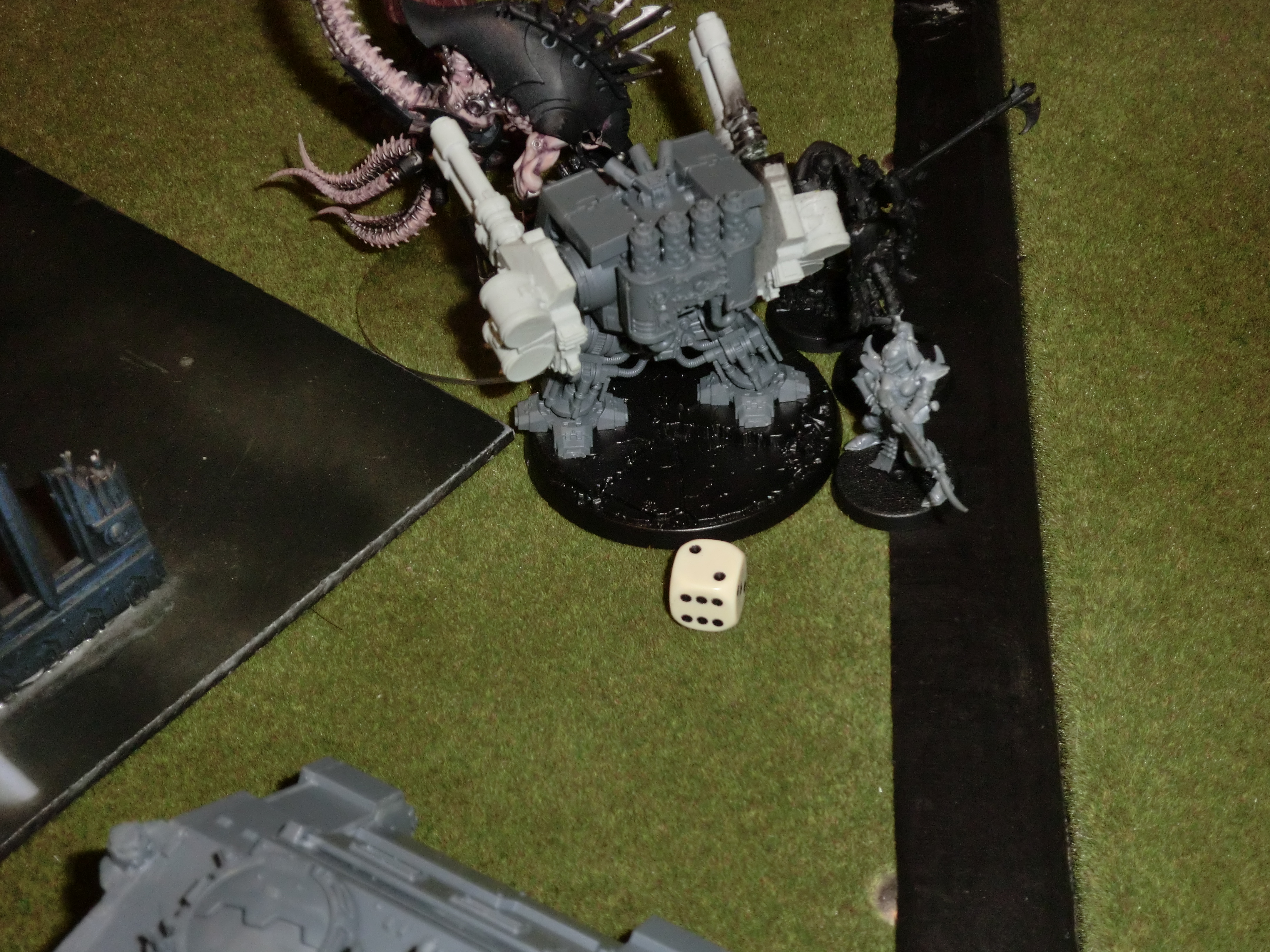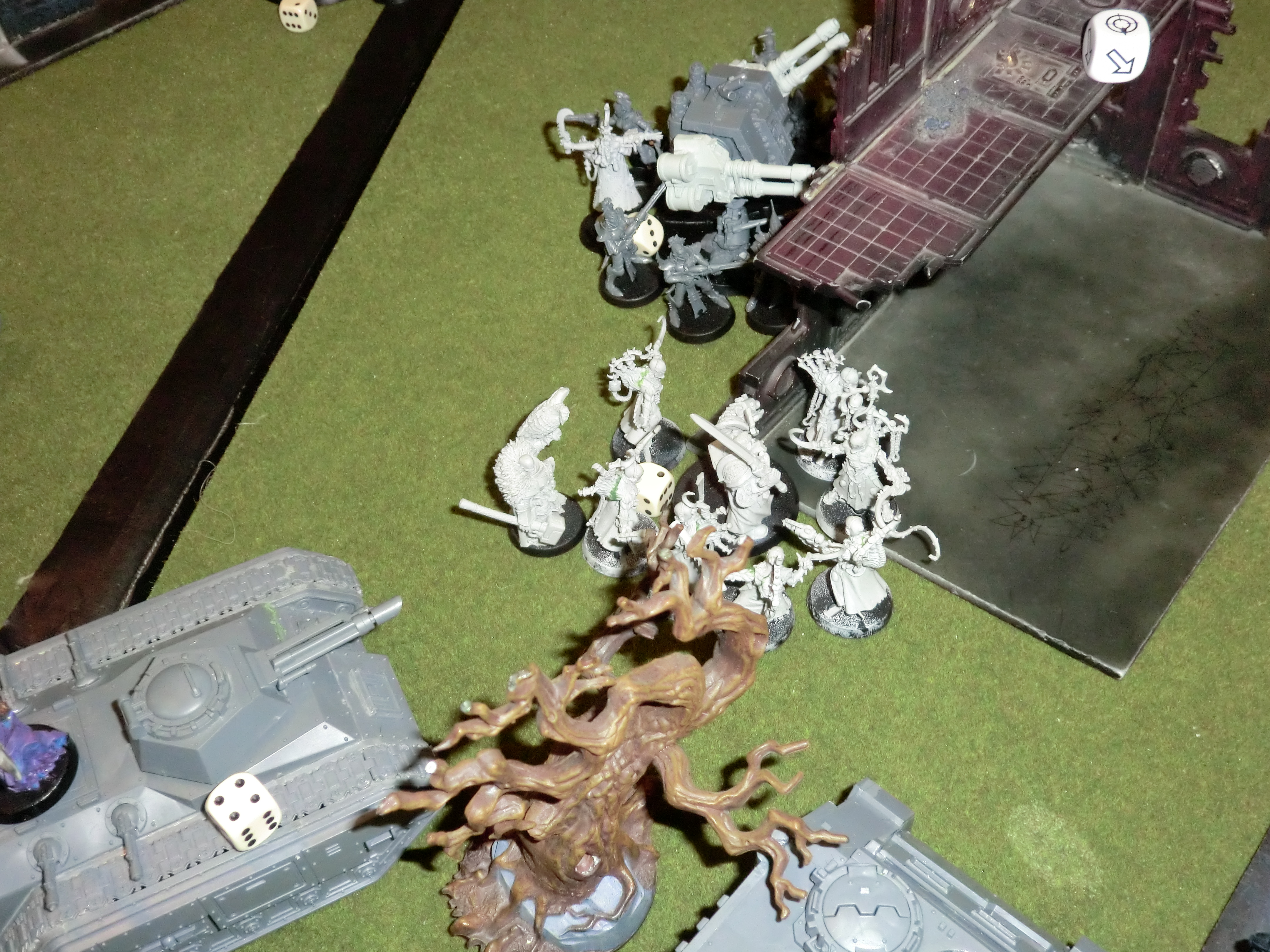 So he won the roll to go first but gave it to me. I then roll for my Grand Strategy and get a 1...the Central Ven Dread became scoring (I did do this before deployment but I forgot to put it up initially). I also rolled a 2 for my Jokaero...36" range multimeltas. It's hard to see but he has deployed his Haemonculi with his Harlequins. The Shadowseers power is supposed to stop me firing. The result of my first round of shooting is shown below.