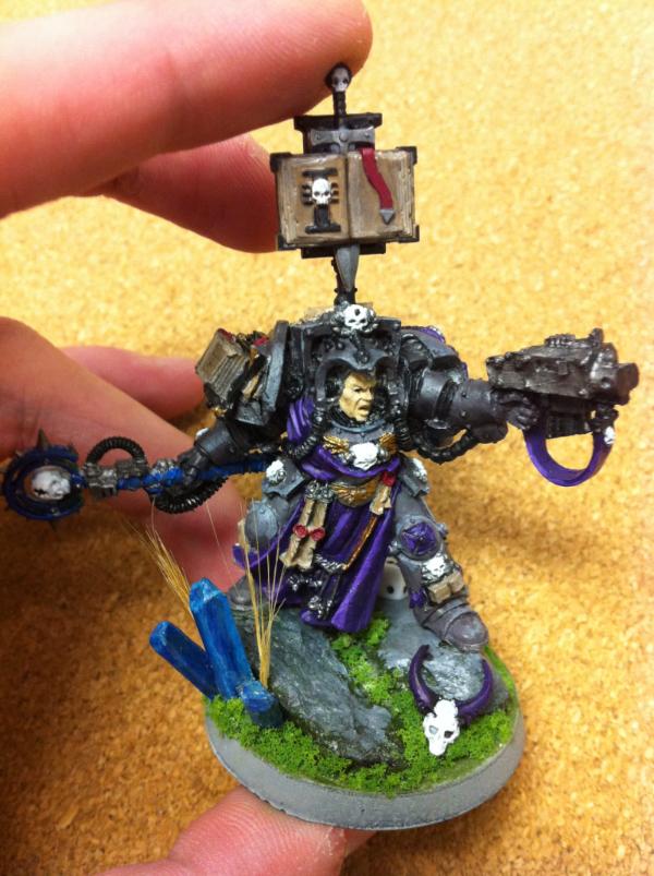 *edit* I just realized you can't see the blade of his force weapon in this photo. But it's mechrite red on the thick part of the blade, macharius solar orange on the edge of the blade, then lightning and etc. working upwards through 75/25, 50/50, and 25/75 fiery orange and skull white, finally highlighted with skull white.