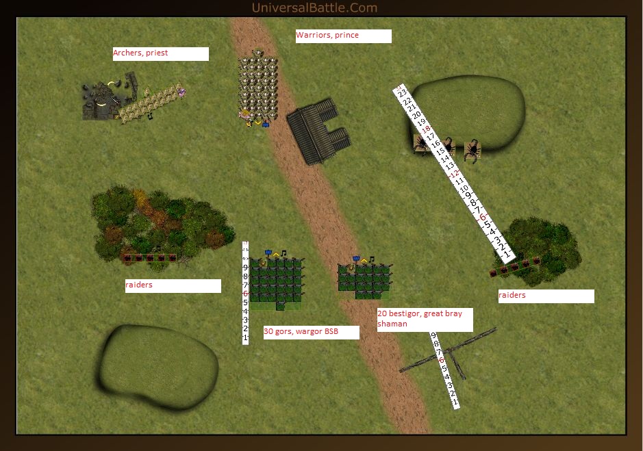 Warriors kill 1, prince inflicts 1 wound on shaman. Bestigors kill 2. Flee 4 inches, warriors pursue 10 inches and run into the gors.