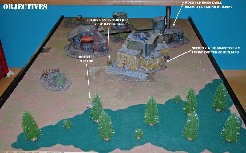 We rolled for the mission and got "Take and Hold" with "Dawn of War" deployment. We rolled & got 4 objectives... here's how they were placed.