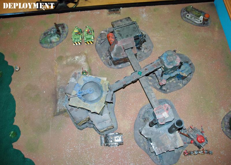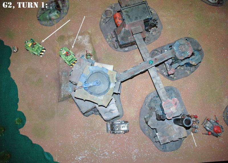 DOW deployment. This is also why the turn text on the rest of the photos is wrong... this isn't really "deployment", it's turn #1. I roll on behind cover and in easy position to reach both of my objectives. Once again I keep my two razorbacks close to one another for mutual support. During his half of the turn, my son comes on a bit more spread out but as I did, covering his two objectives. He uses the exposed unit to cover the rear objective which I am unlikely to challenge (smart).