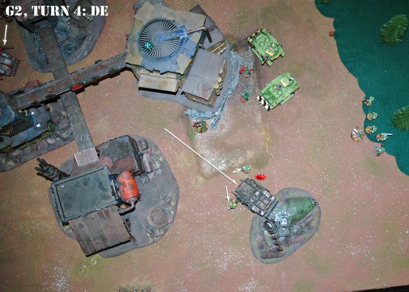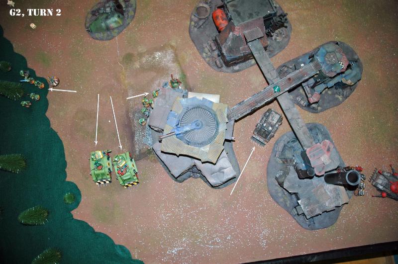 If I'm going to have any chance of a win, I've got to drive him off of one of his objectives, even if I can't claim it myself. My two squads disembark and move to hold my two objectives while the razorbacks with libby and tech in tow go-a-hunting the rhino. My son wisely abandons his forward position, but for some reason is still unsure what to do with his predator to support his forward troops.