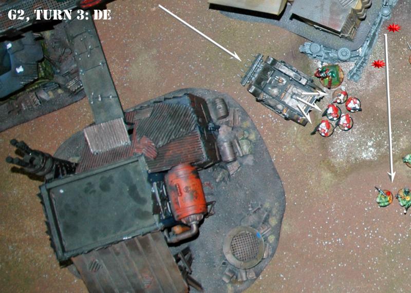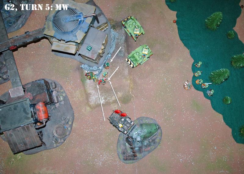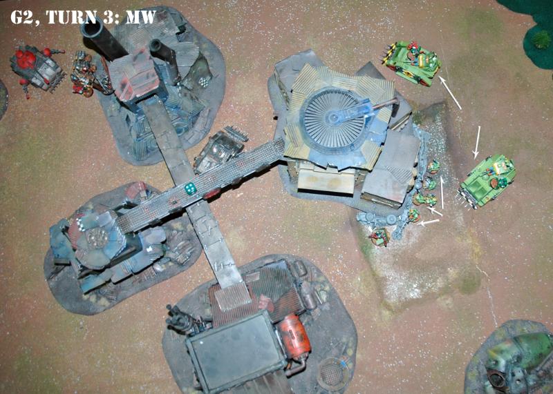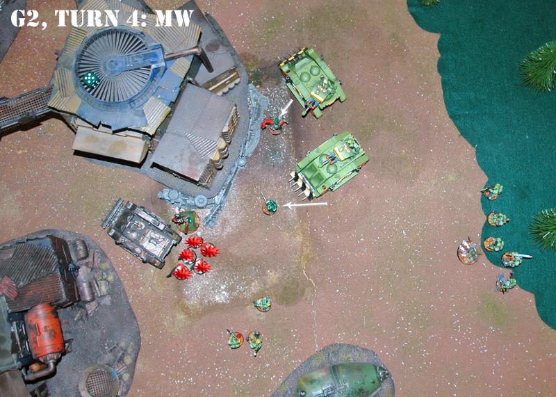 At this point I see that my troops have become vulnerable to the crew in the rhino, so I move one Razorback to discourage his claiming the secret cache while moving the other to support my troops holding the traitor Mantis Warror (nasty bugger!).