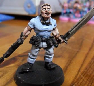 I made mine with with a Cadian torso and legs, catachan head and arms. Specifically I used the Catachan arm with the big a** knife. I also took a grenade launcher, cut it up and glued the end of a bolt pistol on it for a ripper pistol in his other hand.