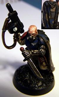 1.) hard-shell tanker helmet (comms) preferably with shades. 2.) Space marine crux terminatus badge. Add it to the model somewhere as a badge of honor or something Barring that, I might suggest a shrunk-down vox-unit (gives the "kitted out" cadian look), with the det-pack stored under it, Give him a las-pistol that's been upgraded with bolt-pistol bits (magazine for instance... to make it stand out as a 'ripper pistol')... Give him the tanker's death's head pauldrons as well and that should do it. Alternatively, just use a Kasrkin sargeant. If he's bare headed just give him a forage cap, and strap a melta bomb or some other charge somewhere.