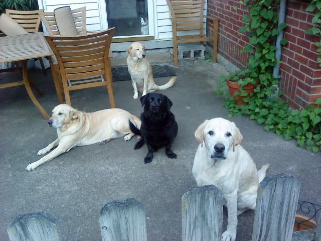 Percy (Black male), Cleo (largest yellow lab), Helen (left lab/Shar Pei mix), Dora (back)